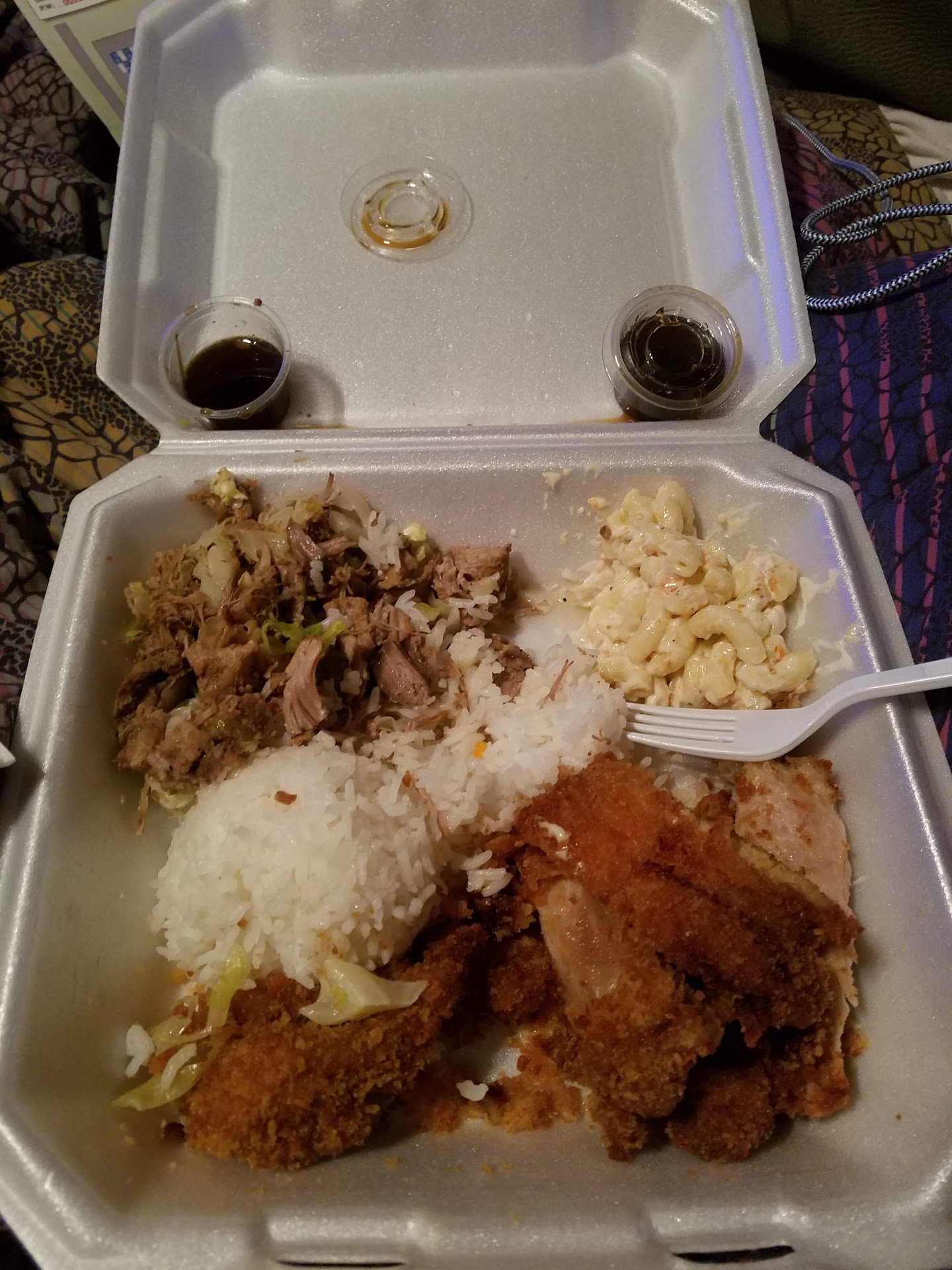 Amazing food and nice, patient, and helpful staff! I had the 1/2 and 1/2 with Kalua Pork and Katsu Chicken, which comes with 2 scoops of rice and a scoop of the macaroni salad. The pork with the cabbage was fantastic, smokey and flavorful, perfect with the rice. The Katsu chicken was pretty good too, a panko coated and fried breast. I think I was supposed to order some Katsu sauce with it, but I don't know. The Hawaiian BBQ sauce made a great dipping sauce, though. My fiance got the BBQ chicken, which was good, but I was grateful I got what I did. The biggest surprise was the macaroni salad. I'm an extremely picky person when it comes to any pasta salads, and I LOVED this. I wish we weren't driving through so I could get a gallon of this stuff. I will return for this.