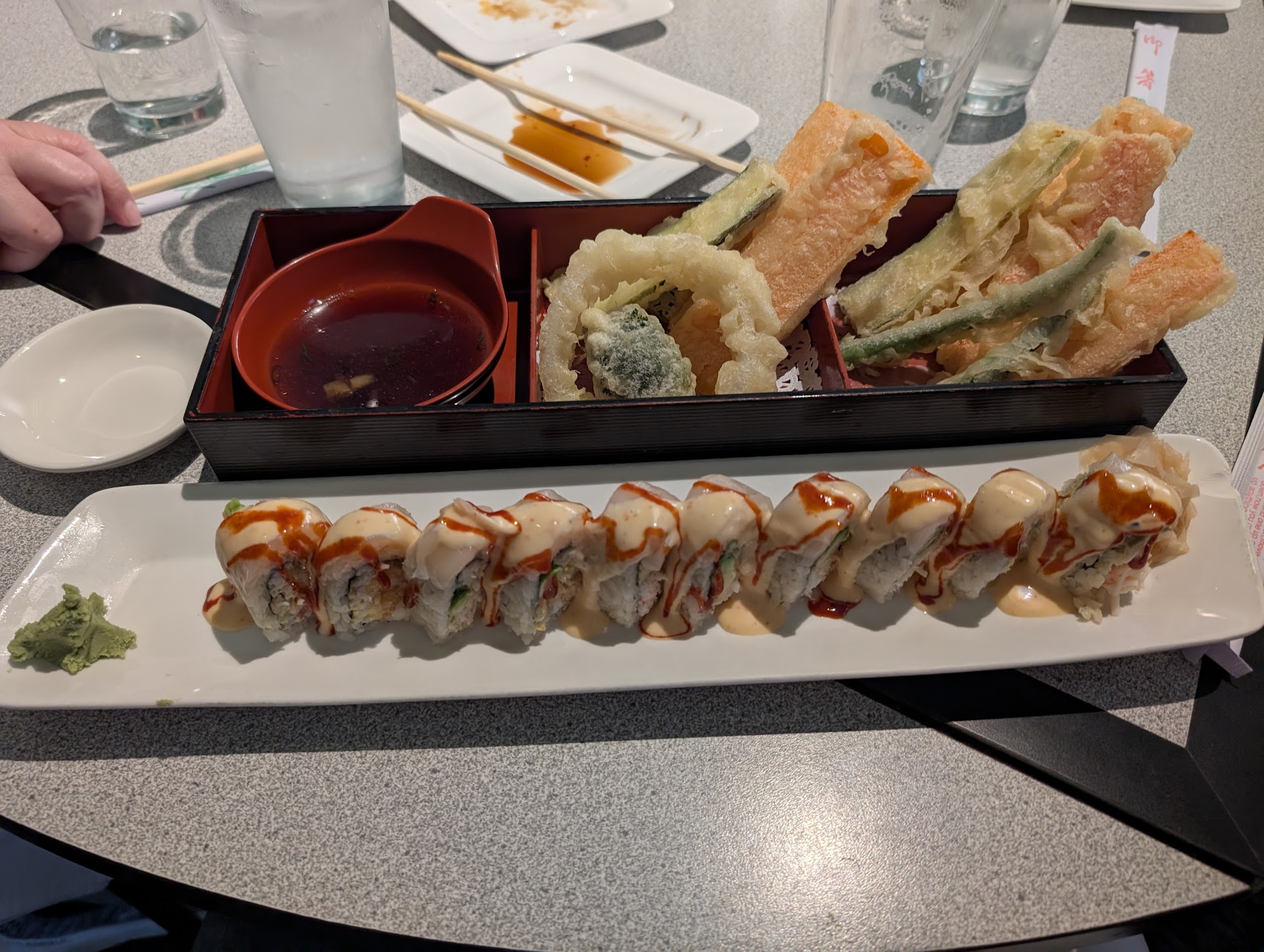 The rest of the meal was disappointing. The specialty rolls arrived with flattened and gooey rice and bland fillings, making me think the rolls may have been made in advance and left sitting for a long time. The waitress removed this item from our bill after finding it largely untouched. I will say that the maguro was very good and the best dish of our meal. My husband's bento box missed all the nuances of traditional Japanese techniques we were expecting, like hot crispy tempura with cruncy texture and well-seasoned beef, cooked on high heat and served promptly. Instead the tempura was limp and lukewarm. The beef was lacking flavor and served room temperature. I will say that he finished the meal despite his complaints. So I guess it was passable for...