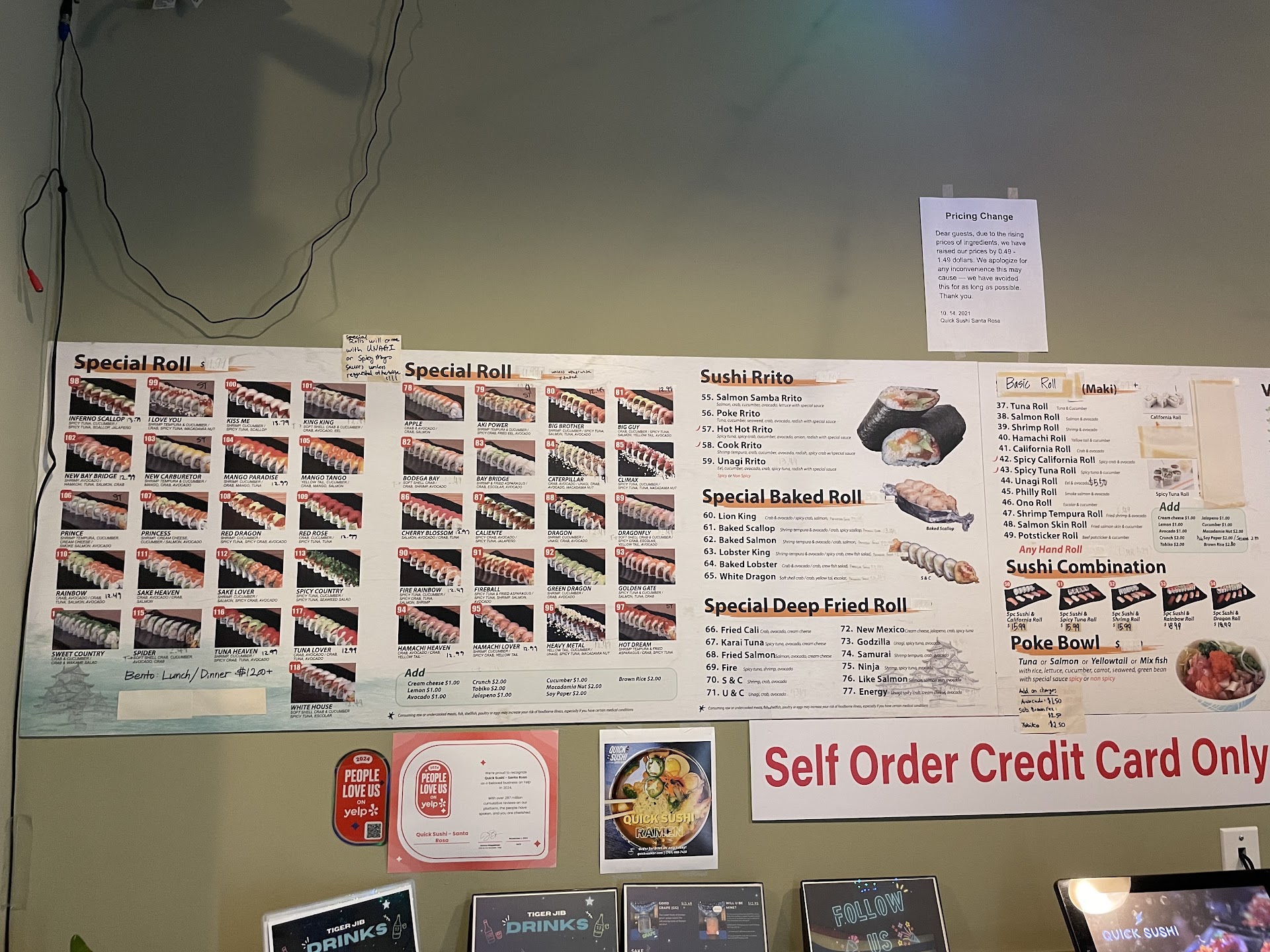 I used to work in Houston, TX & frequent a restaurant that had the best sweet potato rolls. I was hoping for the same taste experience. The sweet potato roll at Quick Sushi tasted good. It just lacked something undescribable that the TX place had with their sweet potato rolls. Anyway, I ordered quite a few other rolls & nigiri. The food tasted fresh. The rolls are neatly rolled. The slices of nigiri fish were pretty large. The staff was very friendly. I didn't venture very much around the restaurant, but they may have limited seating. Although I was happy with my food, I wish they provided more than just soy sauce...some ponzu sauce would be nice. The parking lot is super small & is shared with a financial institution & at least one other store. Depending on the time of day, you'll be lucky...