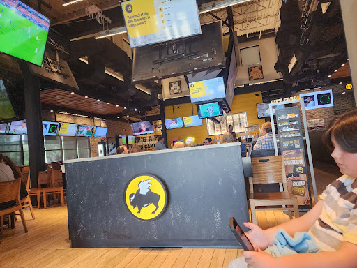 We ordered the lunch street tacos (chicken) which child #1 said were "just ok" but filling enough and the skinny fries were really good -hot & crispy; 10 piece boneless mild wings which child#2 said were really good - juicy, well sauced, and still a little crispy in spots; I ordered the Buffalo Chicken Salad in medium sauce -the chicken strips were perfectly cooked and had the right balance of breading to make it crispy-juicy-saucy, lettuce tasted fresh and very clean, came with 2 slices of tomato, pre mixed in ranch dressing with a light drizzle of buffalo sauce...one note, when I saw the strips I thought they weren't sauced enough; however, after cutting into pieces and mixing into the salad it was actually the perfect amount. Regretfully our 4th item, 10 piece boneless mild wings which was my cousins didn't arrive until a little later, the blue cheese was forgotten and when asked for -came just before she had to go, leaving her time to only have a couple before she had to leave for an appointment. We arrived at 12:50 pm, were seated at 1:10 pm, drinks and food were order right after being seated, drinks came out right away (and refilled), 3 of 4 orders arrived 1:30, last order 1:45, cousin left at 1:55 to make appointment and me and kids got bill and were out by 2:15 pm. The two staff serving our area were very pleasant, sweet, and nice to interact with; also apologetic for the late food and...