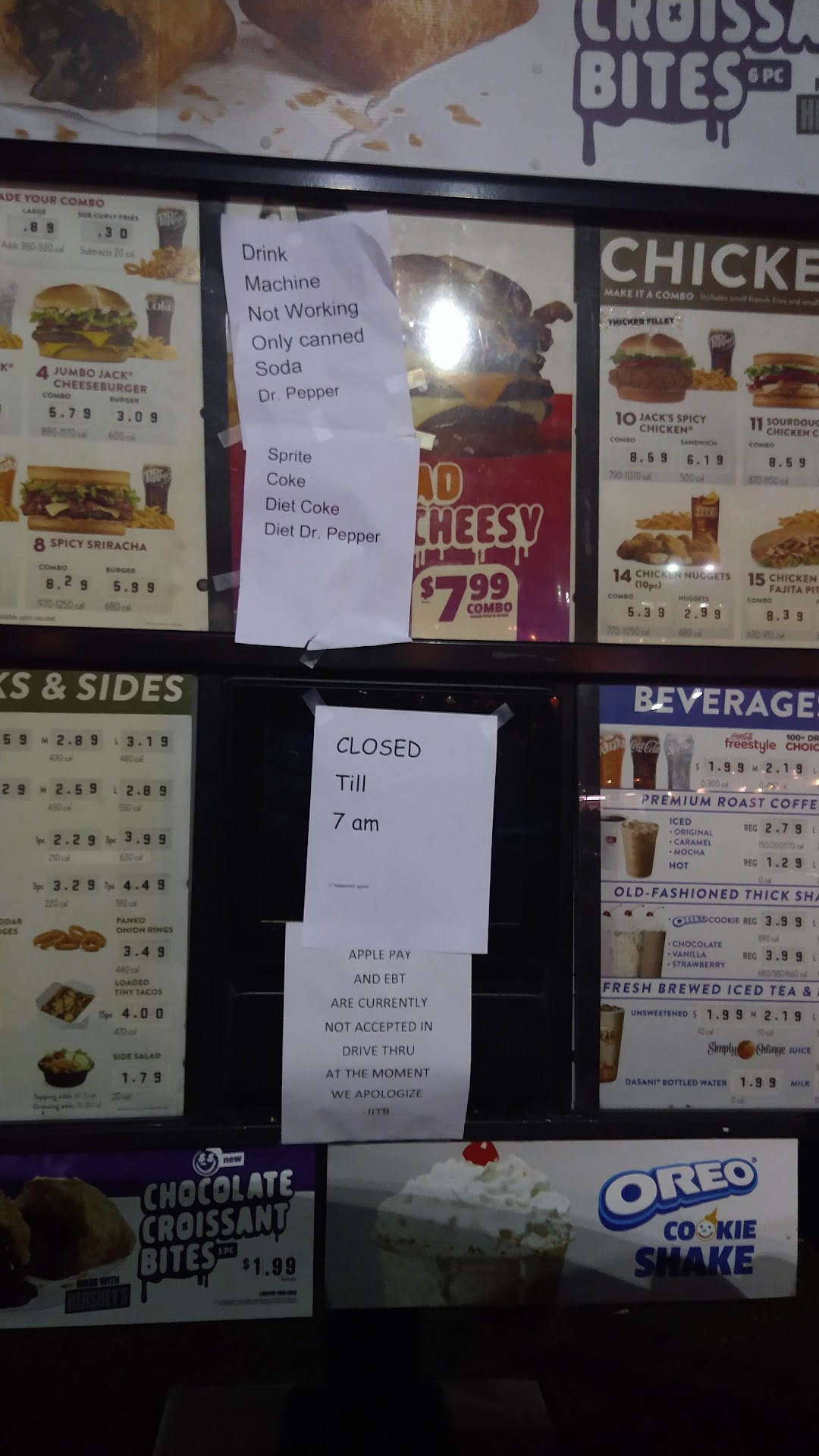 Read moreHonestly, this location is usually good in the afternoons but this time, I don't know what's going on with their staffing but the quality has gone down immensely from previous experiences. Usually there hasn't been much of an issue except them forgetting an item for my meal. Today I ordered a jumbo jack combo with fries and a drink. I ordered the unsweetened iced tea as usual and never had issues with it till now. When I was drinking from the straw a dark grey piece of film went through the straw and I had to pick it out of my mouth. It's not part of the tea and it didn't dissolve. It was weird and never had this issue before, maybe it was a dirty cup inside and someone dropped something in it by accident not sure. After plucking it out of my mouth I went inside to tell them what happened and asking for a new cup. They didn't believe me and I tried telling them again what happened and they just looked at me in confusion. I told them that it was in the drink. They didn't know what to do so I told them to get a new cup for me. The guy working as the cashier said he made sure he looked at it this time. I just wish they paid more attention to detail and are not sloppy when it comes to cleaning or cooking or moving stuff back there. Another thing besides this is that my burger was cold, not even warm. My fries were cold not warm either and was sloppily made. It almost looked like a naked burger, didn't look anything like the picture on the menu. Please hire staff who actually care...