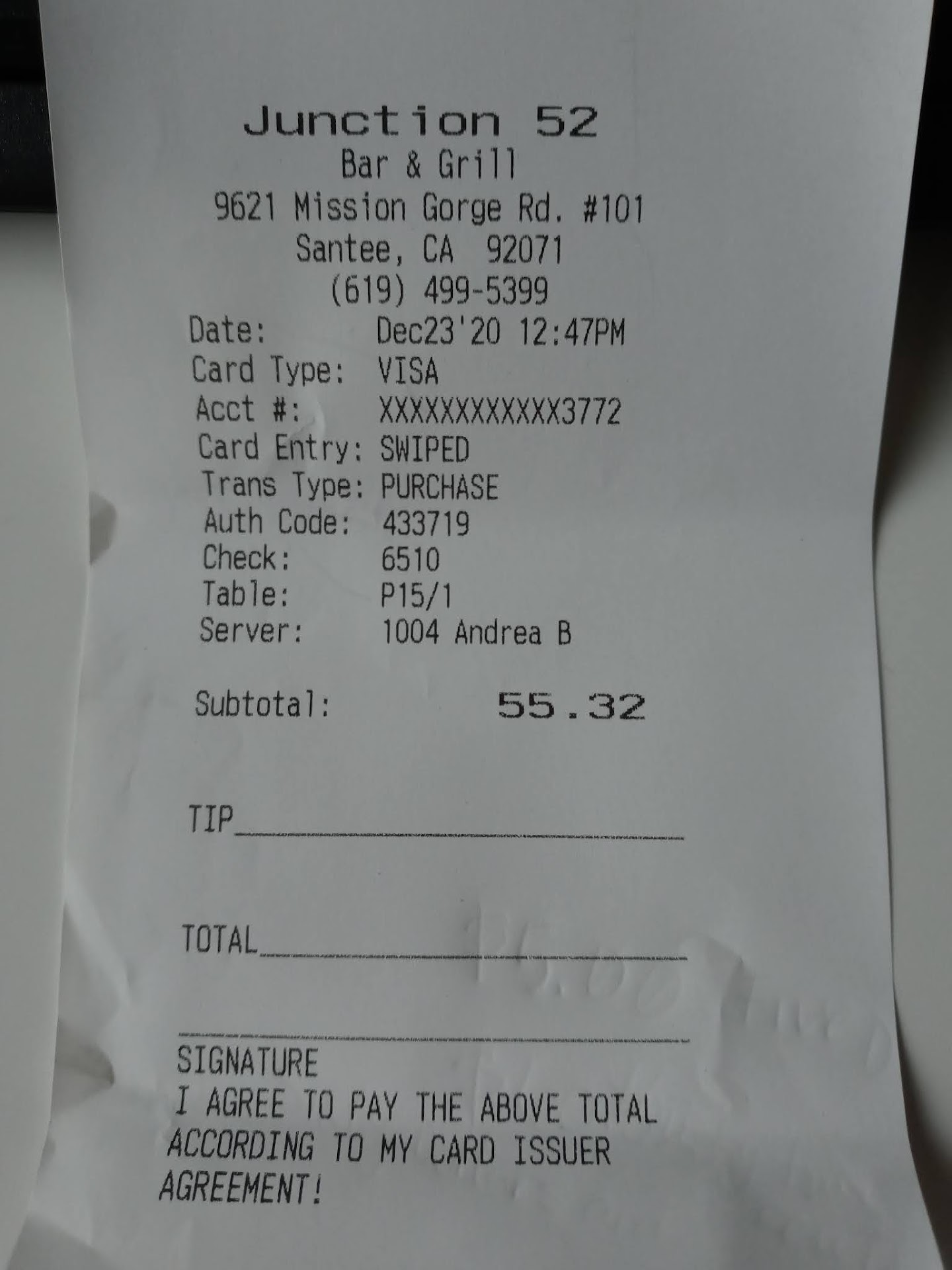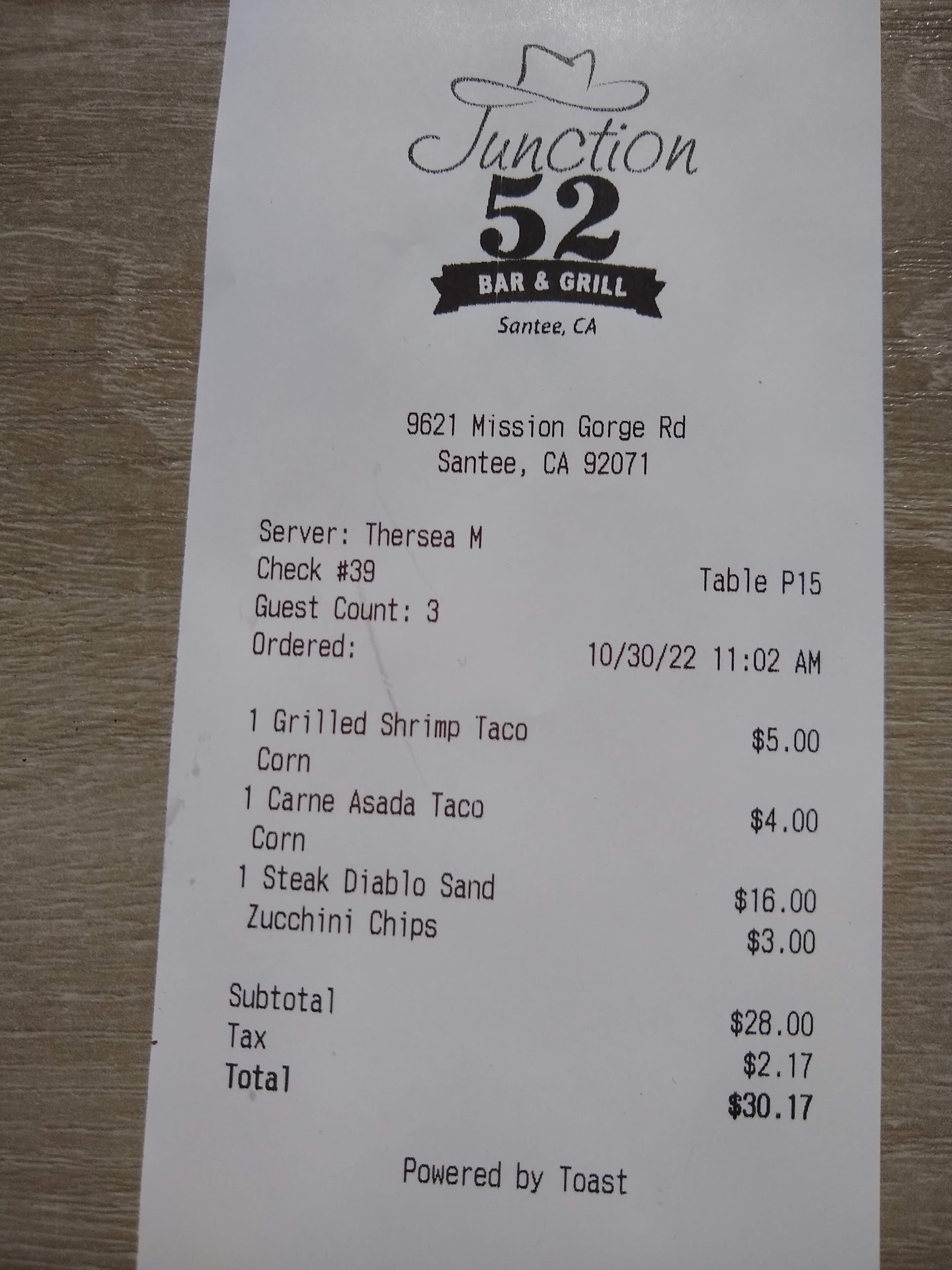 Ā Ā Ā Read moreI recently visited Junction 52 Bar & Grill and unfortunately, my experience left much to be desired. While we were seated fairly quickly, the service took a downward turn from there. It took quite some time before our waitress came to take our drink orders, and by that time, we were already ready to order our food. Despite this, she only took the drink orders and it took even longer for her to return to take our food order.