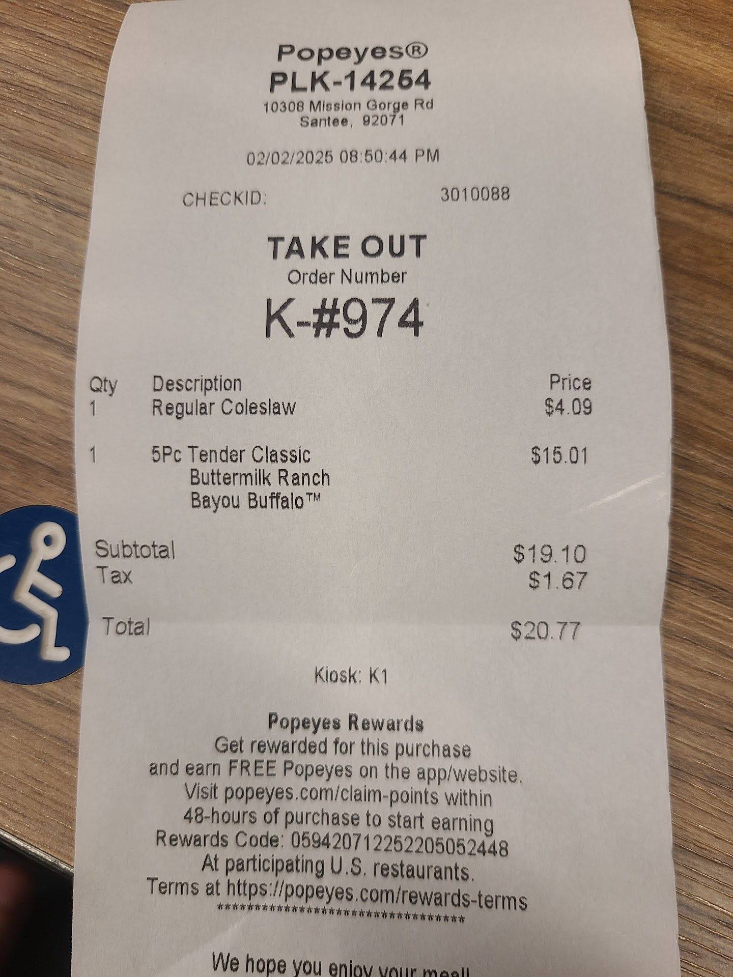 Read moreThe food is fine and the building is clean but the customer service is terrible and the workers are rude. This location is very close to my home but I've been going out of my way to make the trip to the el cajon popeyes just to avoid the santee location, I as well as my family have been treated poorly by the staff and have witnessed multiple times them being incredibly rude to other customers. If they get your order wrong and you bring it up they give you a nasty attitude and treat it like it's our fault, the last time I was there with my family the keyosk wasn't working right and it took 20min for a worker to even talk to us cuz they were avoiding looking towards the front and when they finally came out to help she was very condescending treating us like we just didn't know how to use the machine and when my mother showed her and she had to open the machine to get it started again she acted annoyed we weren't the problem. The worse Popeyes location I've experienced so far very...