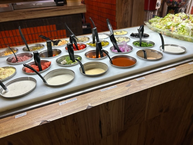 Excellent friendly service from the manager. The buffet was shutting down when we walked in, but the manager said he had a really good deal to offer us. And it was! $19.99 the Couples special: 13” one topping pizza, two drinks and two one trip salads. We got the thin crust, half peperoni and half sausage (no extra cost.) This was delicious pizza. Perfect thin, crispy, crust, not too much cheese or tomato sauce, topped with fantastic sausage and pepperoni. It was a really enjoyable lunch and a heck of a bargain.