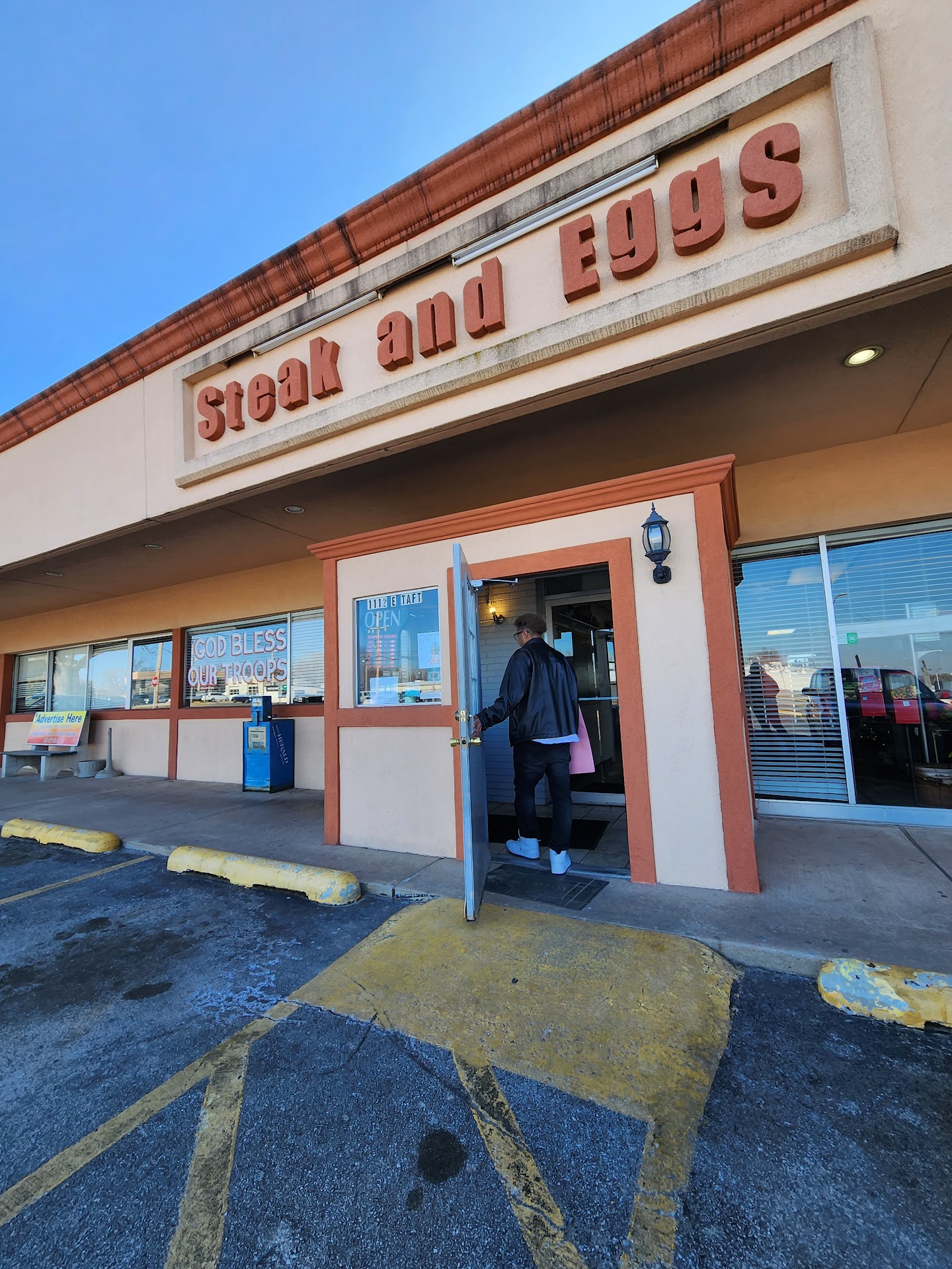 Ate dinner there last night. We have eaten at Steak & Eggs numerous times, but this was our last trip. I had a steak and a baked potato. Should be a cinch for a "Steak & Egg" place, right? No. First, I never believed until last night there was such a thing as a bad ribeye. Well, whatever meat purveyor they use sold it to them. Full of gristle and fat. The potato I asked for loaded, came that way...loaded. It had EVERYTHING on it. Cheese, bacon, green onion, white onion, green bell peppers, mushrooms...I didn't know if they were making a pizza or a potato, but it was missing something...BUTTER! Finest dry baked potato I ever ate. I would have asked for butter, but didn't know it was missing as I had to send the plate back because the steak was raw, not rare, RAW. (I ordered medium). You would think it would be easy to cook since it was as thin as a bed sheet. Once the plate came back, we never saw the waitress again. I never even noticed her drop the check with my plate. $32. For a $12 steak and a $9 chicken. Yeah, drinks are high there. Santa Fe and IHOP are a little farther down the road, but I'll have to make the trip if I want a steak or...