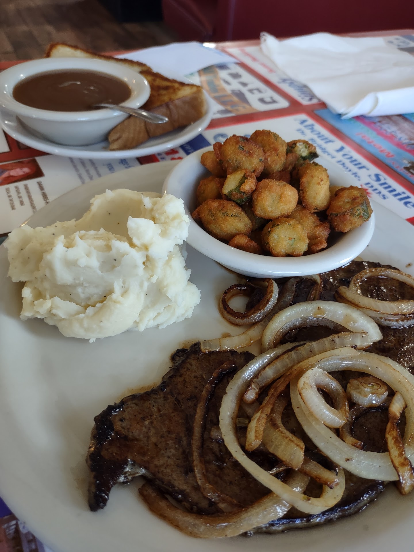 Read moreI was visiting my son. And I wanted some different a little more homie styled food. So we thought we'd try here. The service was very friendly, courteous, helpful and nice. The server smiled, answered all questions and went out of her way to help. Food was good. I think the fried mushrooms needed some seasoning (may a little salt or something). But everything else was good. I thought the grits could use a little water. (Way to thick). Out side that the meal was delicious. My son got the Chicken salad he said was great. Though we were full. We didn't get any dessert. I was told about their famous huge cinnamon rolls. I took pictures and when I come back you see my son I will stop and get one. I love the little hometown feel. And awesome hospitality. If you are new to the area, driving through or already live there, give them a try.