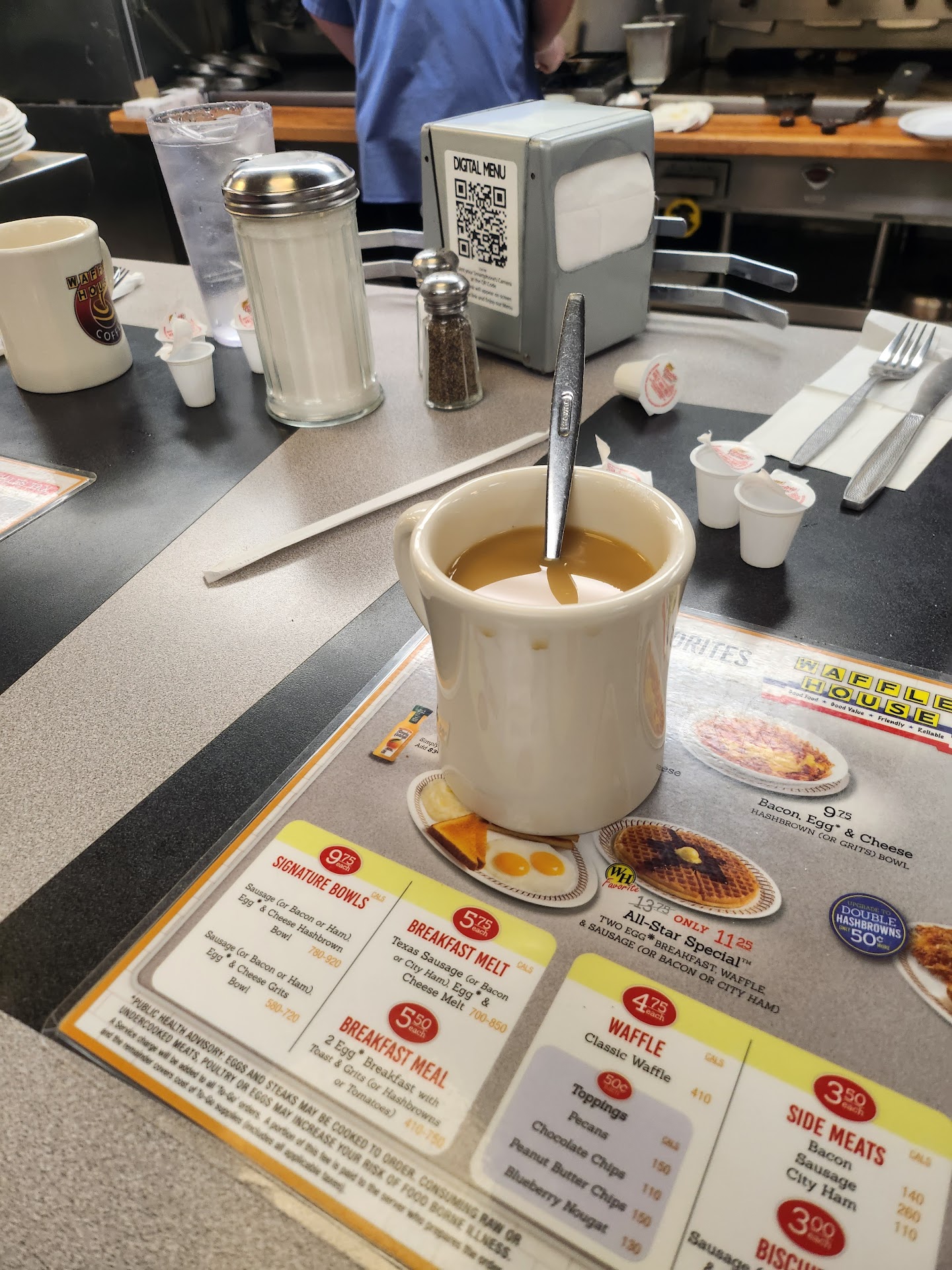 Overall, our experience was great! The Waffle House is my absolute favorite American Diner! This location is the first ever Waffle House I visited as a child, so it was memorable being able to return to it in my 30's and share it with my own child! We even got to play some tunes on the jukebox during our meal! My Auntie bought me the waffle house mug as a souvenir for my birthday to add to my coffee mug collection! I couldn't have been happier!
