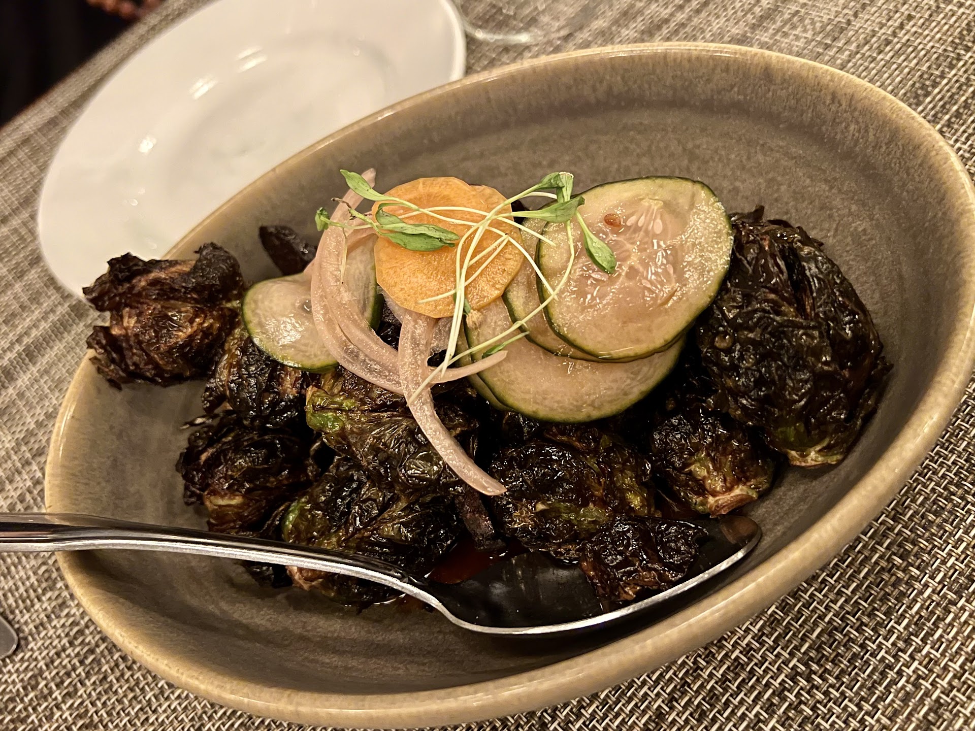 We heard their pizzas were very good for a starter, but they recently stopped offering them. We had the Brussels Sprouts appetizer that’s served with pickled veggies and the vinegary sauce for the pickling. The Brussels were charred and veggies and vinegar were the perfect complement.