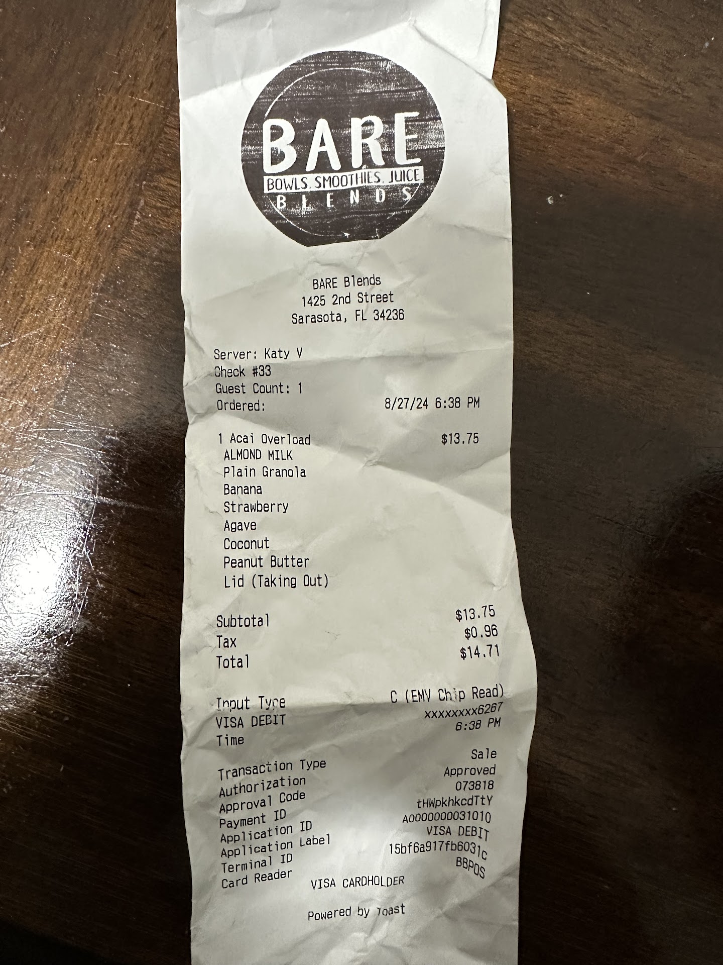 Read moreI had the Acai Overload bowl. It was extremely bland! No flavor, even the granola tastes like nothing, ridiculous expensive $15. I was the only customer and it took them 15 minutes to prepare it. The acai was so frozen that they had to blend it for 10 minutes with almond milk which ruins the authentic flavor of the acai. The service was pathetic, 2 young people goofing around that much that I had to ask them to hurry up because it was taking so long. If you are reading this, don't waste your time here. Drive 7 minutes to the south and you have (Playa Bowl) or drive 10 minutes to the south and you have (3natives) and both are very good, larger quantities, real acai flavor and very importantly, the customer service...