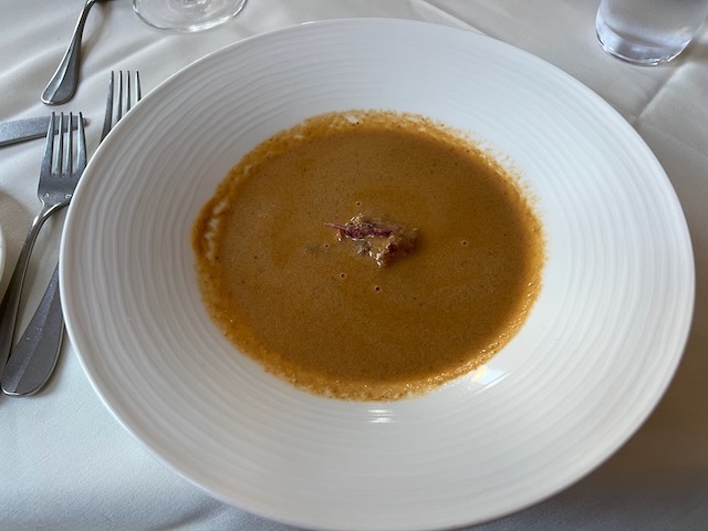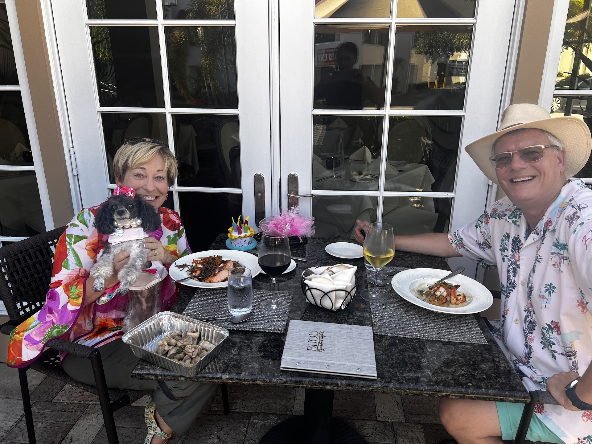 At our appointment hour, the Maitre’D, Donny, came to us to tell us our table was ready. He noticed that we hadn’t finished our drinks. Without applying any pressure on us, he suggested that we either take our drinks to the table or simply finish them at the bar assuring us that our table will be waiting for us. We finished our drinks, settled with Lisa and went to our table. Grayson, our server introduced himself, presented us the menu, and explained each dish with great enthusiasm (Grayson has been serving Bijoux’s patrons for 22 years, so he told us during serving). After the menu recital, we asked him about the special. He proudly replied with an assured smile “Every single item on our menu is SPECIAL”. In my mind, it was the correct answer. And boy was he right. We started off with a gazpacho soup like no other: a composition of freshly roasted tomatillo, cucumber, and avocado slightly elevated with apple cider. The fragrance was exhilarating and the taste was sweetly divine: a roasted artichoke Mediterranean salad was the perfect intermezzo to lead us to our entrees. A perfectly broiled NY strip, medium tender and moist, with pomme frites ( French fries), and a boneless pork chop prepared to perfection and topped with peach chutney with sautéed fennel and onions. We were too stuffed for dessert.