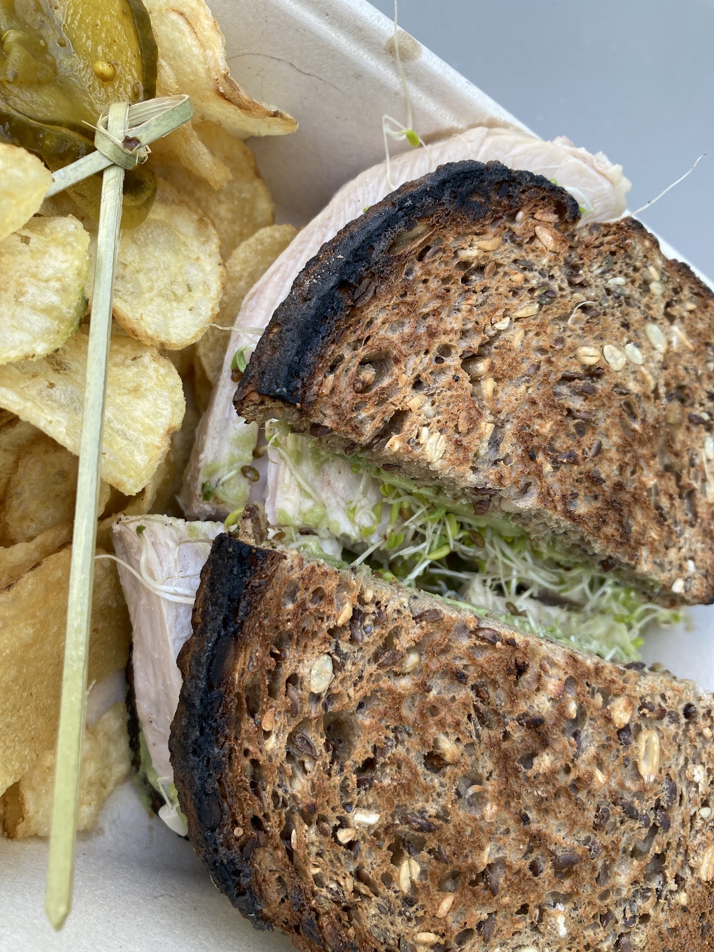 Artsy space with a good vibe located in Paul Rudolphâs 1959 Vocational Shops building behind the Sarasota Art Museum. (Formerly Sarasota High School). No wait staff so you order at the counter and they bring you your lunch. I ordered two soups from The Halves on the menu (choice of two $15). Both soups were hot and homemade. I loved the French Onion soup. The broth was flavorful and satisfying. The second soup was the Vegetable Bisque made with Tomato and Zucchini and roasted red peppers with truffle cream. I donât eat a lot of sugar so this was too sweet for my palate but my friend scarfed it down as he loved it. He ordered the Toasted Corned Beef Rueben ($15). Dark buttered rye toast with loads of corned beef and sweet pickles (on the side) with (not enough) kettle potato chips. Iced teas were (whoa) $4 but were served in a glass which I appreciate. Enjoyed our lunch, the space (large tables with long benches to support a gaggle of friends, if you have them) and plan to come back before everyone discovers it and we...