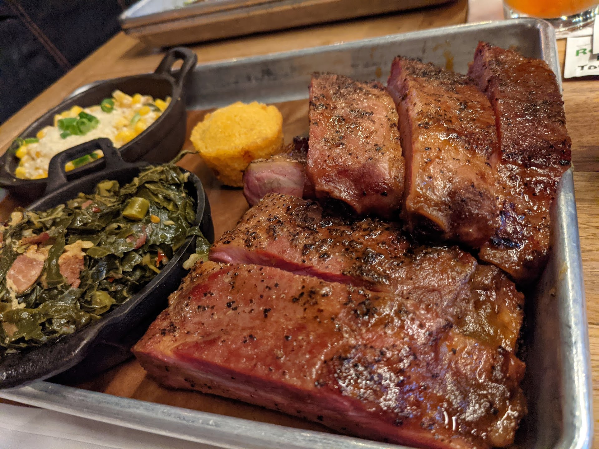 Next - the food! Man oh man the pics I took do not do this food justice. Everything was great but a few items stood out to me. The mac & cheese is very creamy and flavorful, with pimentos. The loaded onion rings are very crunchy and tasty! The kickin' greens are literally KICKIN' you right in the mouth! These are hands down the best tasting greens from a restaurant I've ever had, but beware, these greens are SPICY. I don't mean like a slow burn that gets hotter, I mean first bite BLAMO!! Mouth on fire!! But super tasty! Lastly, the RIBS!! I mean that's what you wanna hear about right? Maaaaaan, you ain't HAD no ribs till you've had these tender, juicy, meaty, perfectly smoked Saint Louis style ribs! I didn't even want to put any sauce on them they were so tasty! Speaking of sauce.. there's is pretty tasty also. They have a sweet, a vinegar based one (brisket), and a spicy one (mild to me).
