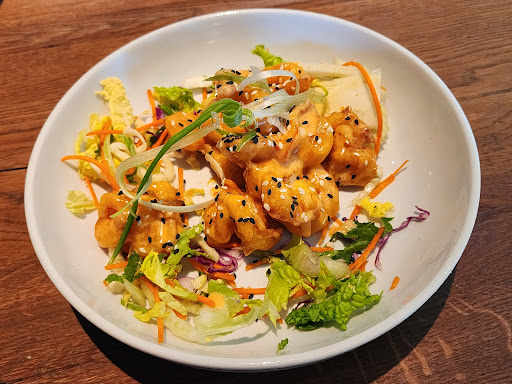 First, it took our server about 10 minutes from the time we sat down for her to even make it to our table. We ordered food and drink all at once because we had plenty of time to think. This was not really a big deal but in hindsight, it was just the tip of the iceberg. We asked for a dumpling starter and she said “I think we’re out of dumplings but I’ll check for you.” Well, that’s the last we heard of the dumplings so we didn’t know if we were even getting them until they showed up. A simple “I checked and we have them” or “yeah we are in fact out of them sorry about that” would have been nice. When they showed up, they arrived with the rest of the food (pizzas). I said “oh it all came at the same time.” Our servers response was “oh yeah I rang it all in at the same time.” Apparently you have to specially request for your “starters” to come before the meal. When we did eat the dumplings, they were fine, except one of the six dumplings was ice cold. How can 5 of them be fine and one be ice cold? A microwave? As far as drinks, food, etc. I kept saying “thank you” when our waitress would put stuff on our table and not once did she ever respond. No “you’re welcome”, “no problem”…nothing. During the main course, we wanted more bread, and we needed napkins and refills. What was our waitress doing? On her phone…constantly. It wasn’t just her either. The hostess was on her phone as well as the “boss looking guy” in the white chefs coat…everyone was on their phone. Our server didn’t come by our table from the time we got our food to the time we finished eating despite trying to flag her down, so we never got napkins, or more bread, or refills. Her attitude was so disinterested in being there it was unreal. Ive never had a more absent server. It wasn’t even busy! There were 5-8 parties or so spread across 3 servers. We usually tip servers very well because we know how hard it is, but this was unreal.