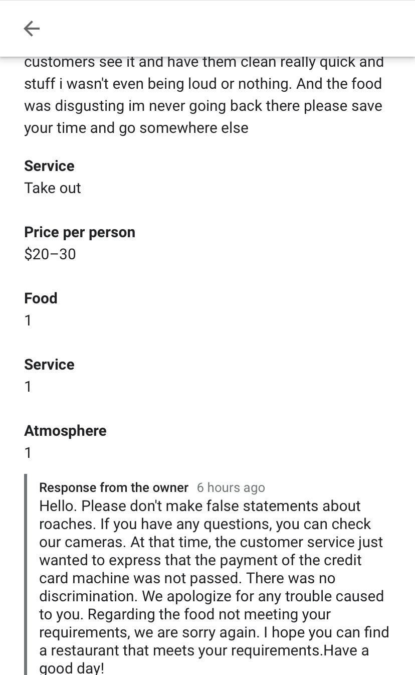 I’ve had an awful experience with this Restaurant, I went in to get shrimp fried rice and sesame seed chicken upon payment the cashier had a disgraceful look upon his face and as I was processing my payment, he was stating that I had insufficient funds and I couldn’t make my payment of $9.95 that and that I should call my bank, as I was there making the payment I did check my mobile app and I had well enough money to make the payment, so I went ahead and use a different card after explaining to him that I did have enough money and I even showed him my bank account statement through my mobile app, so I proceed through and used another payment method. I felt totally discriminated upon, and as I was reading the reviews before submitting this review, I noticed the owners responded back to another statement referring to me. The young lady was black or have Melanated skin as I and they think that it was me. This just prove to me that there is discrimination in that restaurant and as they did stated to her, I definitely will find another restaurant to go to that will meet my standards that is totally uncalled for and...