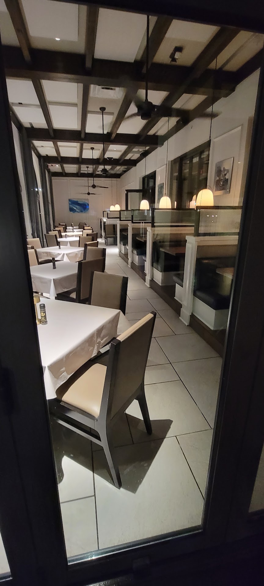 However, a closer look at the decor revealed some choices that felt more for maintenance than customer experience. For instance, while the booths table were bare wood, our table featured a vinyl-covered 'tablecloth'. This detail, along with others, suggested that while the initial impression of the ambiance was good, it didn't quite match the refined feel expected for a truly special occasion.