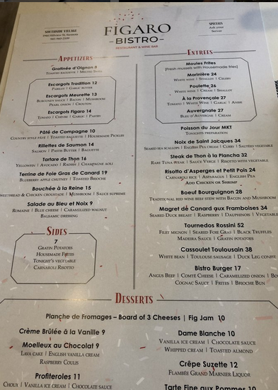 Read moreHaving lived in Paris for 3 years, I'm always looking for a good French Restaurant. I'm sorry to say Figaro Bistro is not at all to my expectations. My son was down visiting from NYC, so I decided to make a res at Figaro. Our res was for 8PM and we arrived 5 minutes early. Our table was not ready, though there was an empty table. We were barely greeted and asked to stand at one of the side tables near the entrance, so we waited and were not offered a drink or anything. We are seated and I had them cork the bottle of Bordeaux that I brought since their wine list was lacking in choice and very over-priced ($20 corkage fee). I started with the frois gras terrine, which was dry and a very small portion. My son had the mussels and there was barely any broth at the bottom and no flavor what-so-ever. While we were waiting for our main entrees, we had to ask several time for bread and butter ( very strange for a french restaurant). I had the Beef bourguignon and my son had the casseoulet. The beef bourguinon was very chewy and burnt tasting (very disappointing) and my son's casseoulet was just OK, lacking in the flavor of all the herbs you look forward to when enjoying casseoulet. This place is not worth a second visit, and over-priced for such a small bistro with a...