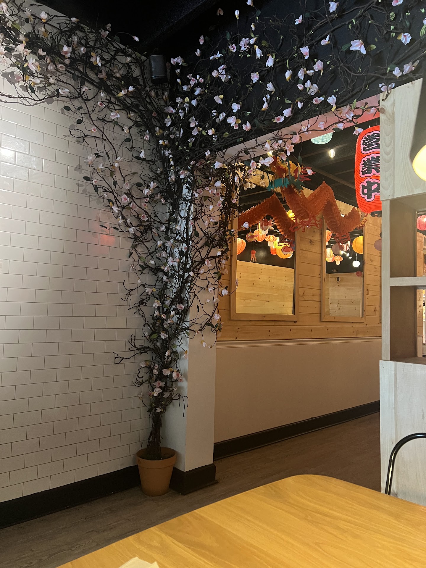 The vibe is colorful and relaxed, with fun decorations, paper lanterns and pretty cherry blossom trees make the place feel fun and colorful. kids love playing the board games while waiting for the food. We also love the fresh lemon water and the little condiments area where you can grab whatever you need. They have a wall full of Asian snacks, candy, and drinks you can buy, the kids always find something fun to take home.