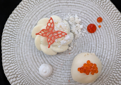 The cheesecake is silken, lightly scented with saffron and rose. There’s coconut chocolate cremeux at the base, adding richness. A hazelnut crunch provides snap, while a snowfall of coconut snow cools the palate like a whispered reminder of restraint. Then, for no reason other than audacity, there’s rose caviar—tiny orbs that burst floral and sweet—and a swirl of coconut rose gel, all finished with a scoop of cardamom ice cream that’s so perfectly spiced it almost hurts.