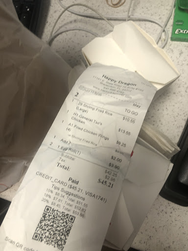 Ā Ā Ā Read moreWith Truman's being unexpectedly closed today, we were compelled to try Happy Dragon (again) for lunch. My wife ordered chicken and broccoli, and I ordered chicken fried rice, along with drinks, $22.68 + tip. We sat at one of the five tables and waited. After a while, the young lady behind the counter called out to us, "Take-out eat-in?" My wife replied eat in. Whereupon the take-out packaged and bagged order was left in the delivery area next to the ordering station, for us to go get and deal with ourselves. I wouldn't have minded all that, even though I had already tipped well, but the food was THE WORST Chinese food we have ever had (and I'm also a NY/NJ/SF/DC guy, used to outstanding Chinese). The only worse meals of my life I can think of were LRPs (freeze-dried dehydrated field rations) and K-rations in the jungles of Vietnam. The chicken tasted boiled, machine-cut into long, thin strips, roughly 3/16 inch square and two to three inches long, slimy and tasteless. A few peas, a few micro-cubes of carrot, rice that had been fried only in someone's imagination. No number of packets of soy pepper sauces could revive this mess. The portions were large, as ordered, but we ate the minimum needed to make it until dinner tonight, and dumped the rest in their trash can. Nothing was even good enough to take home and use in making soup. For the life of me, I can't understand how anyone could ever like a meal...