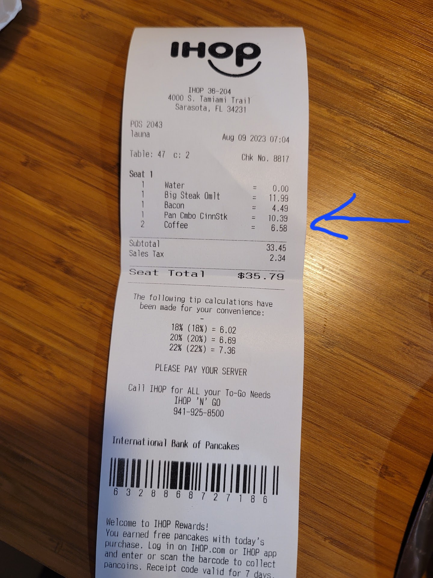 Read moreI stop at IHOP maybe once every couple months. This is my first visit to this particular location. We arrived at 620am (20 minutes after they opened) and we were the 3rd table started in the restaurant. The server, Launa asked what we wanted to drink and I ordered a coffee and water, my partner ordered an iced tea. We were immediately told by the server that they didn't have any iced tea because she "hasn't made it yet". She told us to pick something else to drink.