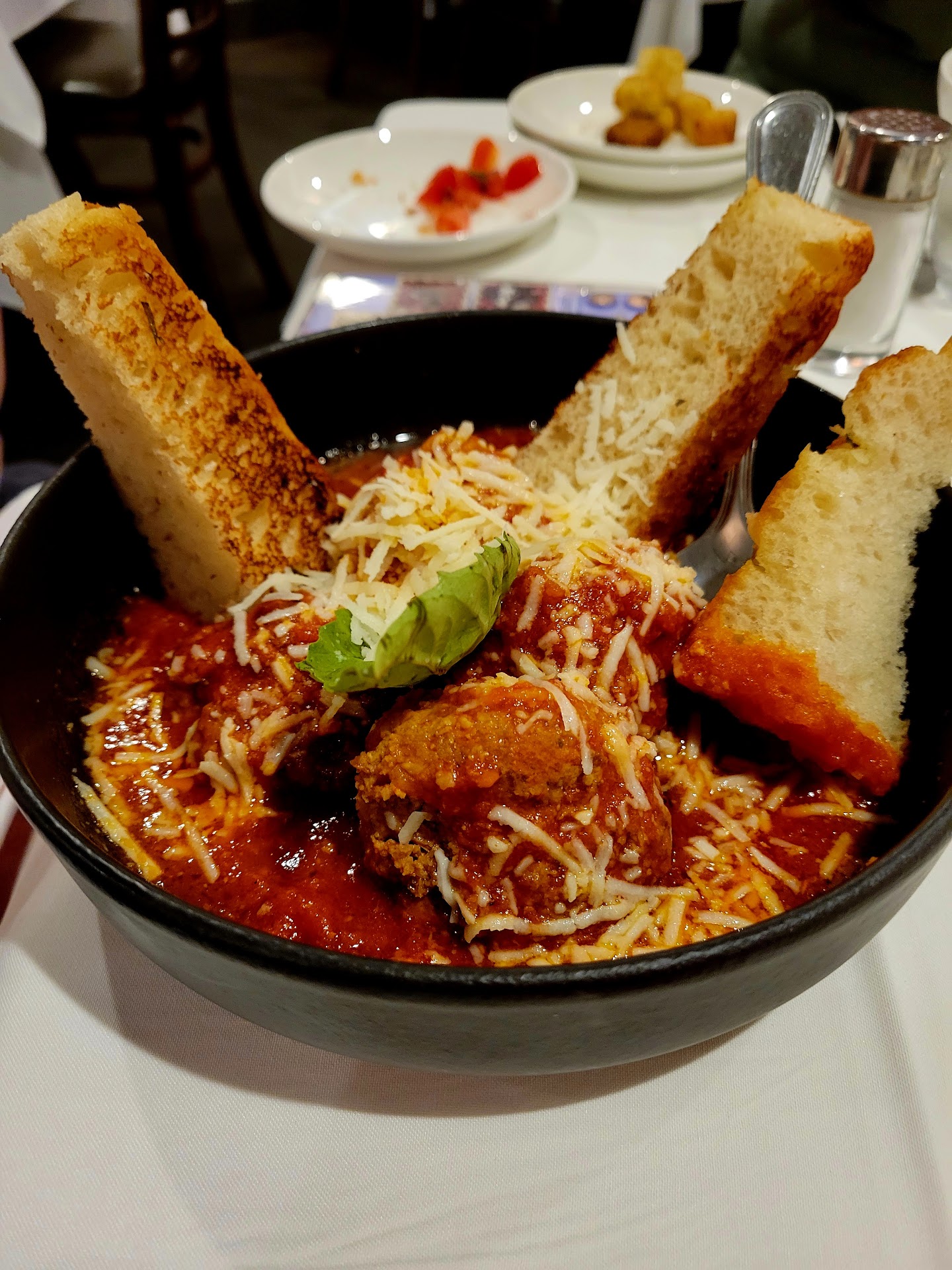 We had a little bread and some chopped olives and olive oil. A little bruschetta made and appearance as well. The mixed drinks were very good according to the "boss" and I had a Stella N/A that was served properly in a chilled glass. Not crazy expensive.