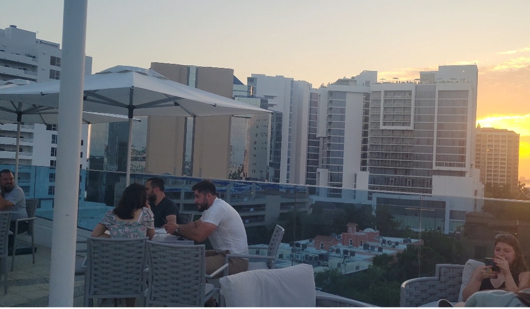 Read moreThis place has a lot of potential, but you never know what to expect. It could be hoppin', or it could be dead. It's a large amount of space. The first area you enter is quieter so you can talk with your friends or date. There are a few private cabanas around the perimeter, and several lounging sofas throughout. The pool usually has two glowing balls floating around. It's not roped off, but I've never seen anyone swimming at night. Just beyond the pool is the bar area. The barrier is glass that you can see the town through, from 8 stories up. There are tables and chairs with umbrellas. The area is triangular shaped, with the bar running down the right side. If it is a busy night, this area will be very crowded. Plan on spending quite a bit for your cocktails. A captain and coke in a rocks glass runs about $10. There's been talk about a DJ in the space between the pool and the bar. But I'm unsure if they have been permitted for that yet. There was music playing, just no DJ. Overall, it's a cool location with great views...