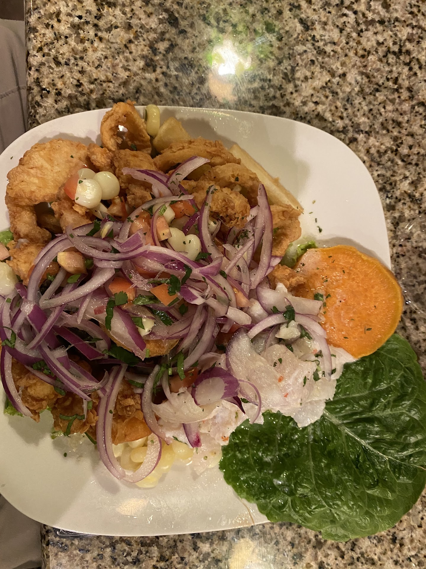 We started with an order of 2 empanadas which they offered to cut in half so that we each got a good taste. They were terrific, with perfectly done crust, and a chicken filling, which was superbly seasoned, with just the right amount of moistness. The waiter, equipped with a set of photographs, proceeded to describe their 8 most popular dishes, although he stressed that all the other dishes were equally excellent, stressing that all dishes could be tailored to our specific likes, degree of sickness (all are mild by default) & if there were ingredients, you didn’t like, and encouraged the discussion to select a change to make it more to your liking. After his top-notch dissertation and patient answering of our many questions, we ordered two beef & two seafood entrées. E made several such mods including having my Jalea Mixta & Ceviche Combo medium spicy & the