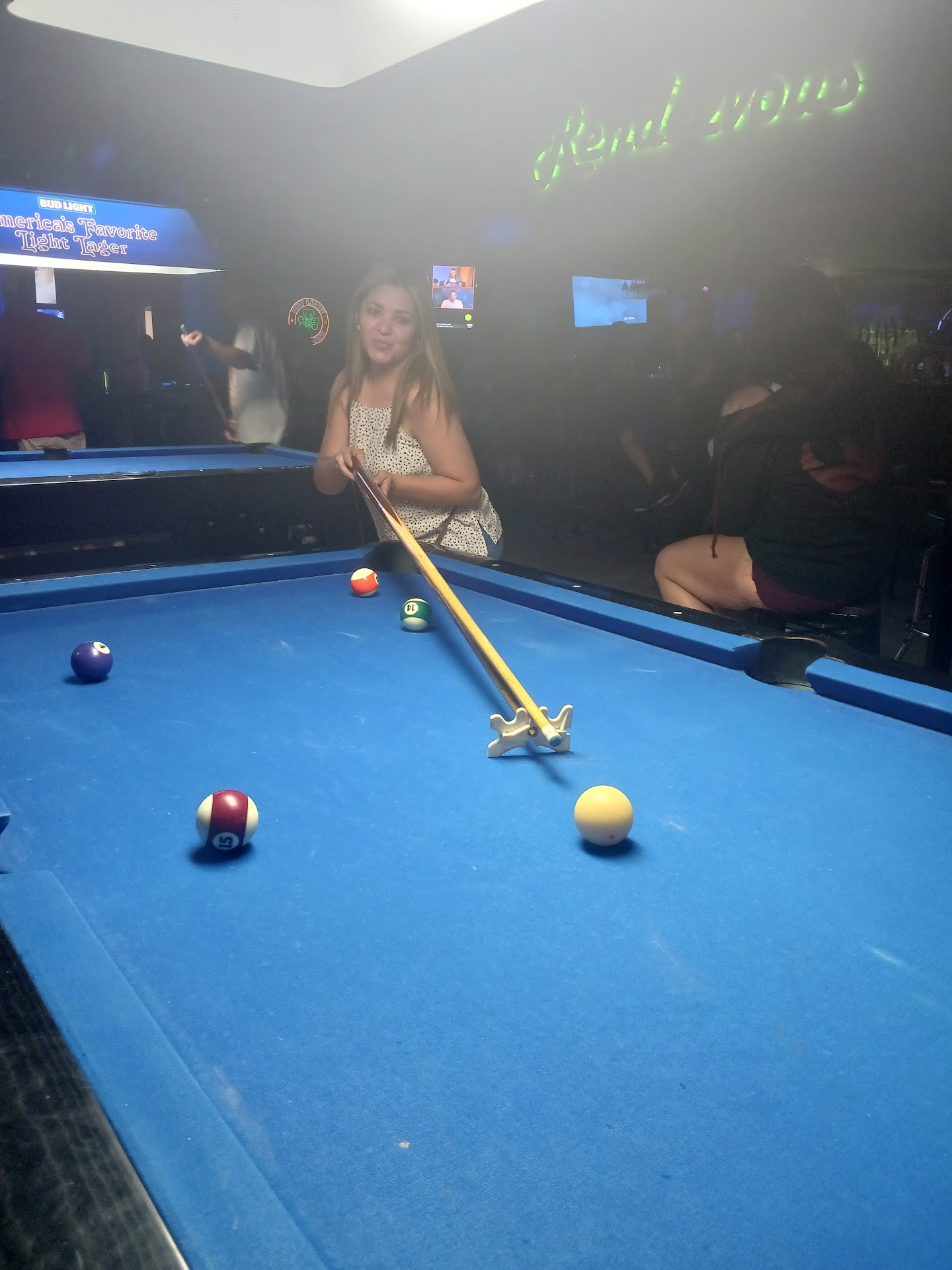 It's a dive bar that shares a plaza with a liquor store and a coin laundry mat. The only things missing are a vape shop and an "Arcade". It took about 15 minutes to get acknowledged at the bar. I wanted a draft beer but the keg was out. I ordered whiskey which is measured out to the 10th of a drop by some gooned up electronic pouring device that must have come from Canada. They serve food in a smoking bar, not sure how they get past that regulation. They have 3 7ft Diamond tables in there that they don't have adequate room for. 3 times in 3 racks an obstruction prevented me from taking a proper shot. If there is a worse dive bar in Sarasota I hope I...