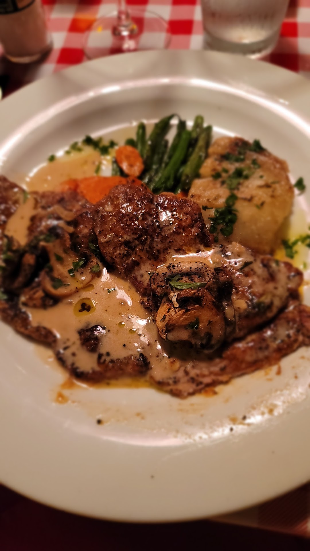 Unfortunately, our dining experience began to lose its charm. The bread and salad were lackluster. I had hoped for a decent wine selection, but with just a handful of uninspired reds, we opted for the $48 Bordeaux, which was underwhelming. When I tried to chat with Rick about the wine options, he quickly dismissed my questions, which dampened the evening. He was unengaged and visibly uninterested in our presence, showing no enthusiasm or hospitality—just a brisk response that made us feel unwelcome.