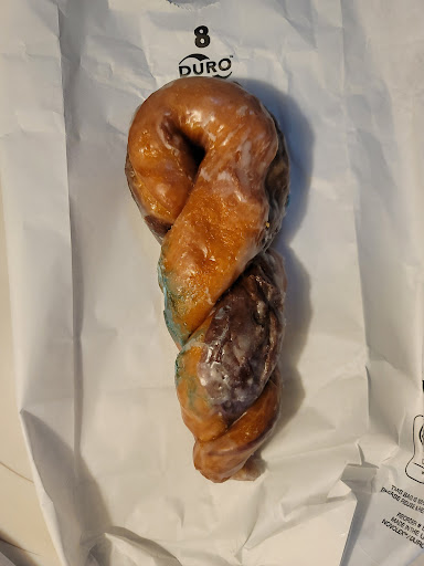 I picked up a couple items to try: tiger tail donut, apple fritter and Asiago bagel. There was some color bleed in the icing on the tiger tail, as you can see in the photo, but it did not affect the taste. Sometimes I like the simple donuts, raised and glazed, or glazed chocolate cake. If a place can get those right, chances are the rest will be good also, so I thought the tiger tail would be a good test. Apple fritters are hit or miss, so they are also a good test item.