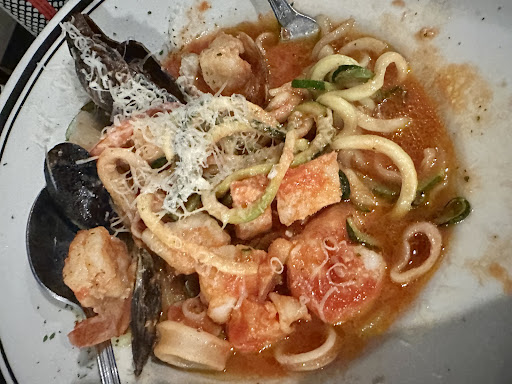 On my most recent visit, my dining companion and I decided to indulge in the Linguine Frutti di Mare, but with our unique twists. I opted for zucchini noodles paired with a sweet marinara, while my partner went for the classic pasta with medium marinara. Both dishes were nothing short of exceptional; the flavors were divine, and we savored every bite. In fact, we were so thoroughly impressed that, despite our best efforts, we couldn't finish our plates, a rarity these days.