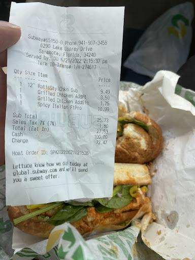 Read moreThe person helping said he was the manager. He said he name is Mike. He over charged me an extra 5.25 with no regard. An extra 5.25 for grilled chicken on top of the regular price. I did not ask for extra chicken. I asked how much it would cost for extra chicken and he said 3.50 and I declined. Refused to make me a new sub after refusing cost. I just paid over $15 for one sub that has hardly any chicken...