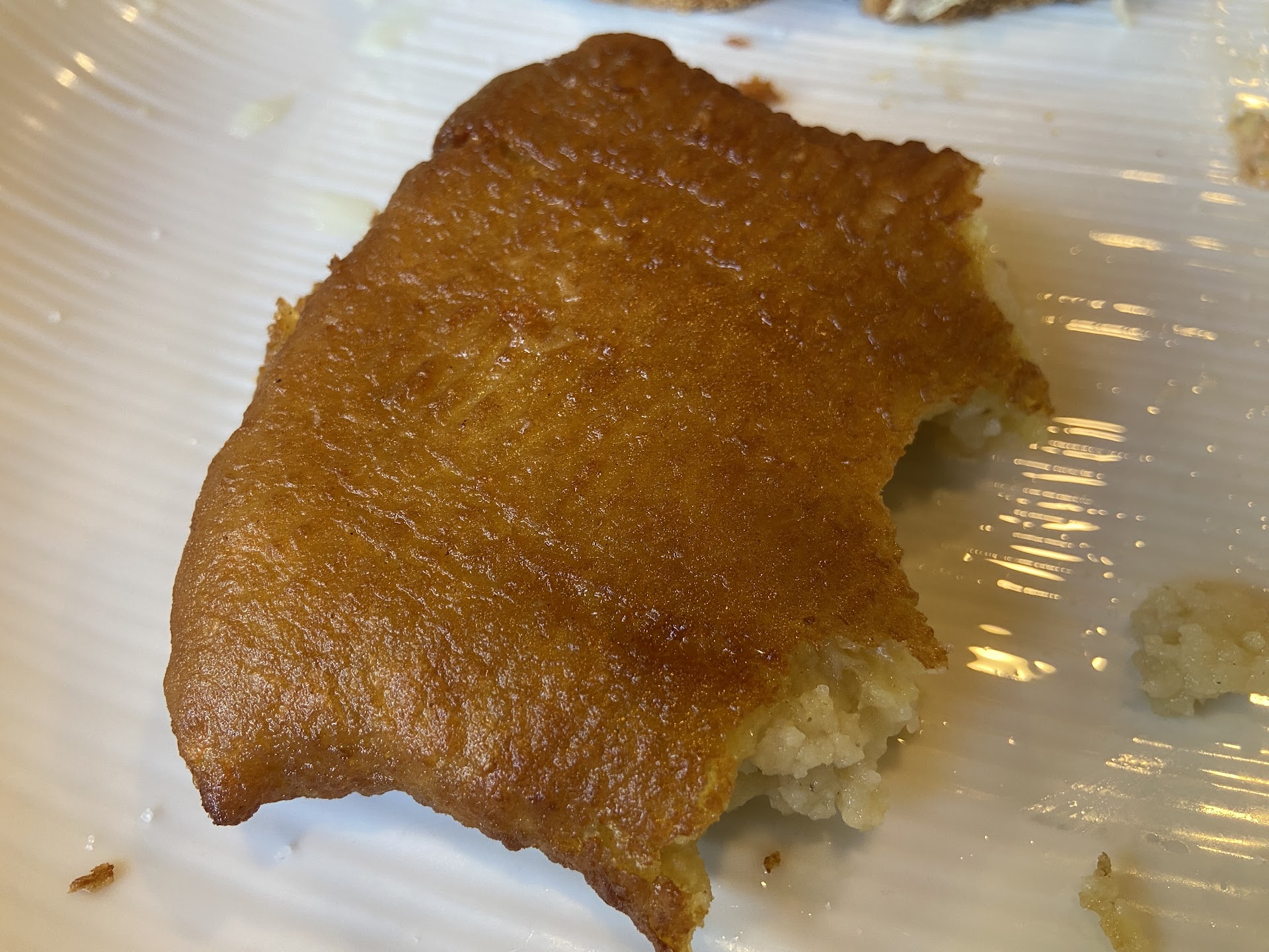 Our Kinish was deep fried, ok… But never drained, came out swimming in a pool of funny tasting oil that had to be soaked off the plate with one napkin and then wiped down with another, then even after it looked like it was wet, it was so soggy you couldn’t even cut through it with the knife.