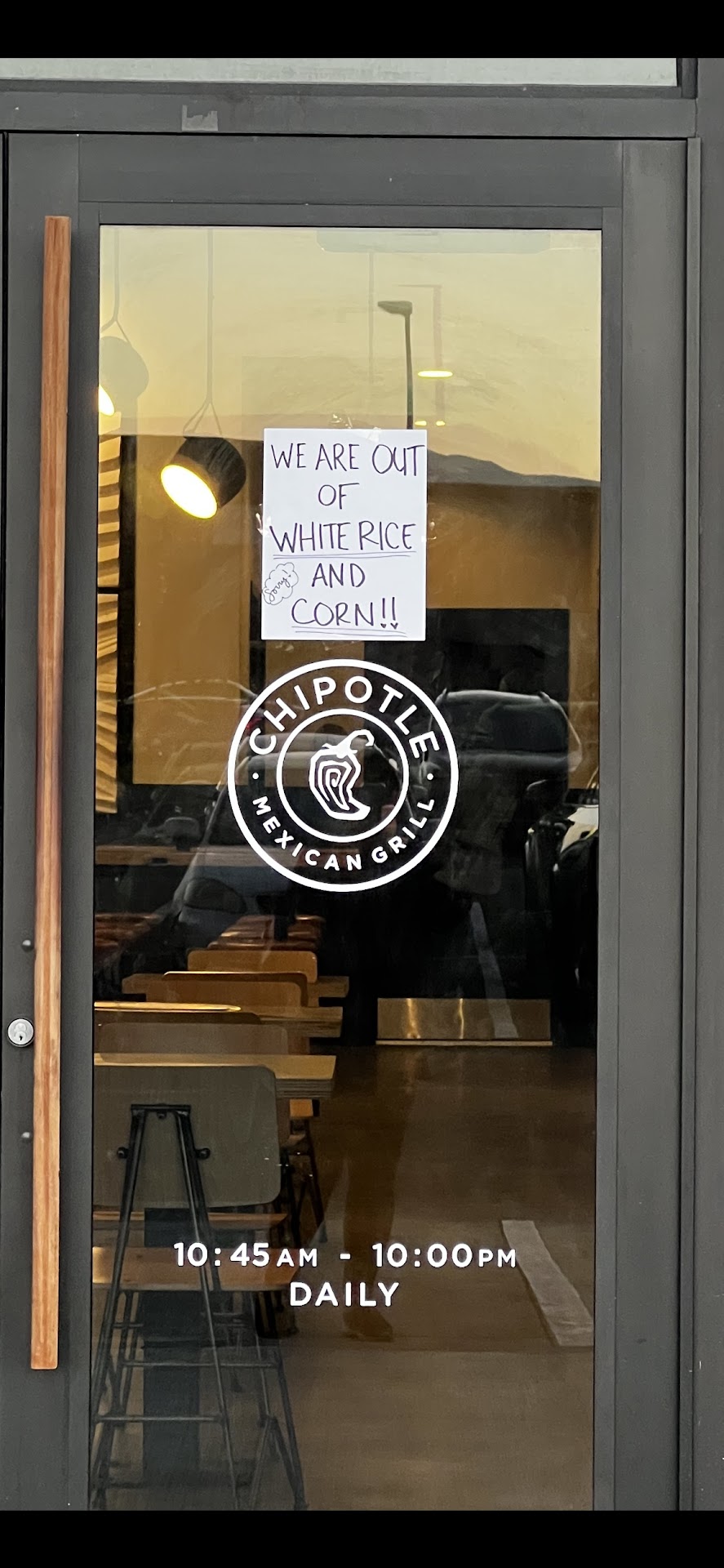 UPDATE 10/10/22. We moved from Washington State recently and Chipotle was a staple for us. We miss it and decided to give this Chipotle another try. After a couple months in business hopefully they’ve gotten their groove. This time we weren’t going to order online and went inside. As we approached the door there was a sign saying they’ve run out of rice and corn? Corn? Do they mean corn salsa? Despite the fact that we live 2 miles away, we drove 20 minutes to the Lehi Chipotle. Maybe we’ll give this location another shot next year? I hope they get their stuff together because we are big Chipotle fans and it’s killin’ us to be so...