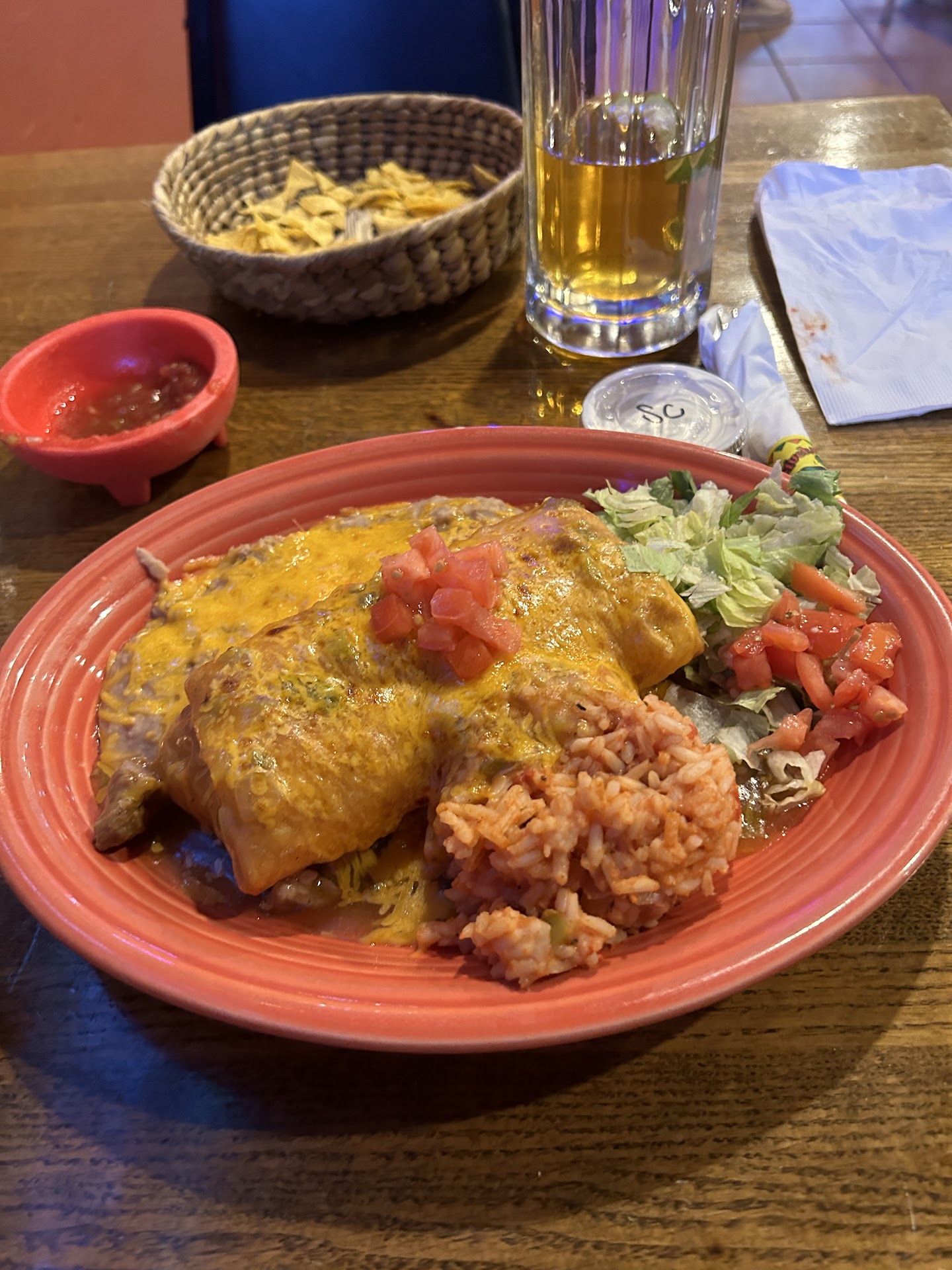 We were excited to try this place out, but boy were we disappointed. We started out with drinks and I ordered the spicy margarita and it was good! My only issue is that the menu said it was a 12 ounce drink and it was served in a small glass not even a margarita glass and it maybe held 10 ounces and my drink was 1/2 filled with ice. They brought chips and salsa to the table, the chips were warm and crunchy, nicely seasoned. The salsa tasted like it came from a jar, not bad but not good. I saw they had queso on the menu so I ordered a side of queso. It was terrible, melted Velveeta , probably generic Velveeta. Gas station nacho cheese is way, way better. I ordered the grilled chicken burrito, my husband ordered the Navajo taco. The presentation of the burrito looked promising, but unfortunately that was the best thing about the entree. The grilled chicken in the burrito was food serviced grilled chicken with that fake grilled flavor. The rice had minimal flavor but was so sticky I bet you could use it to hang wallpaper. Rice a Roni makes better Spanish rice. The refried beans well they were beans, not sure you can ruin refried beans out of a can. My husband’s Navajo taco also looked tasty plated. Not so much, he said the beef had the texture of canned dog food and was very runny, the fry bread was edible but tasted like it wasn’t fresh just reheated. This was the most expensive bad meal I’ve had for a long time, maybe ever. The chips and salsa were gratis as per usual in Mexican restaurants but I was charged $8 for the side of melted Velveeta cheese. The maybe 6 ounce margarita was $9.50, burrito $18 and Navajo taco was $14. The service was good, we were seated right away order taken in a timely manner and our waiter was attentive. We won’t be back which is unfortunate as there isn’t many places to eat...