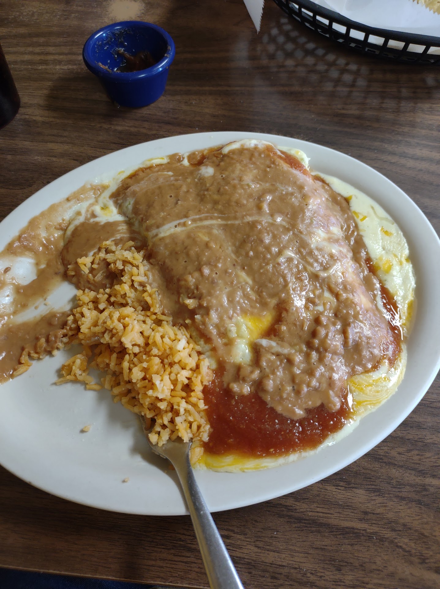 As I walked in I was greeted by a waitress who told me to sit anywhere. The place was fairly busy. She brought me a drink with chips and salsa. I ordered the special which was on the board as "Sanchos". It was 3 smaller rolled flour tortillas filled with a beef, bean and rice mixture and topped with cheese and fresh vegetables, served with beans and rice.