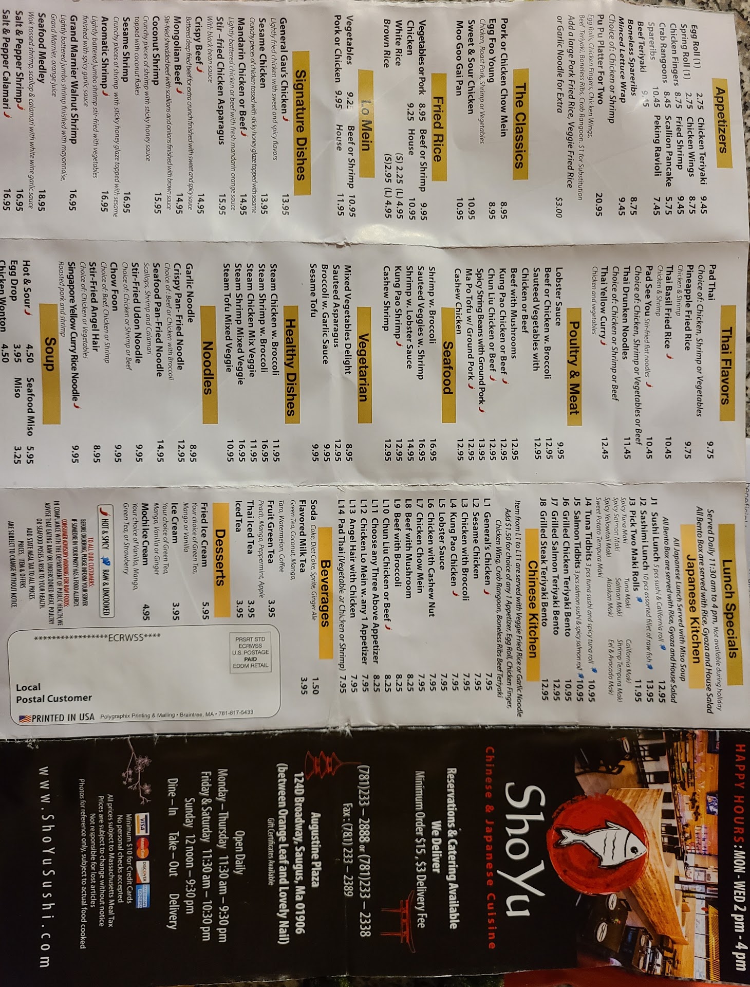 Read moreI don't know how long Sho Yu has been there but this was our first visit. My wife and I had been regulars at Out of Asia for years when they closed recently. So we needed a new Asian food spot and a friend recommended Sho Yu. Walked in the place and was immediately impressed by the cool vibe that the place has, a kind of retro-modern look. Sushi bar to the left, booze bar to the right, both look inviting and comfortable, but we chose the dining room. Service was friendly and efficient. Menu was fairly extensive and has all the classics as well as some house special items. Our order was for beef teriyaki, Peking ravioli, salt & pepper shrimp, sesame chicken and fried rice. And we loved it! Shrimp were fresh and crunchy. The Peking ravioli were the best I've had in a long time and not doughy. The beef teriyaki was sweet and savory, again one of the best I've tried. They also serve delicious lemonade and freshly brewed tea. This place is awesome but it wasn't busy at all which I found surprising. It should be packed and once word gets around, it will be. Go now! My wife and I have a new favorite...
