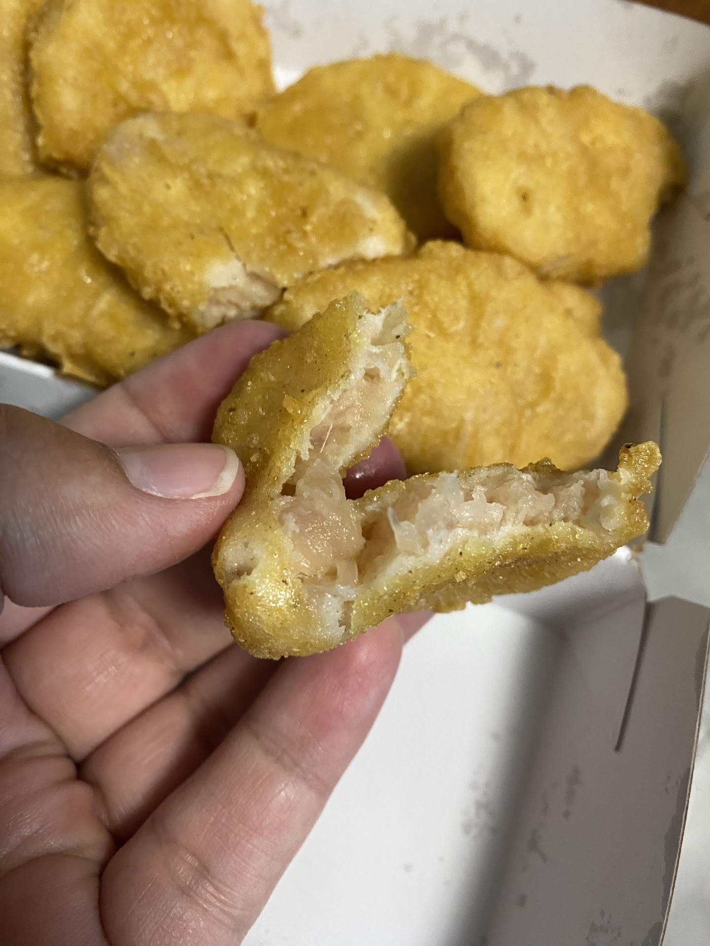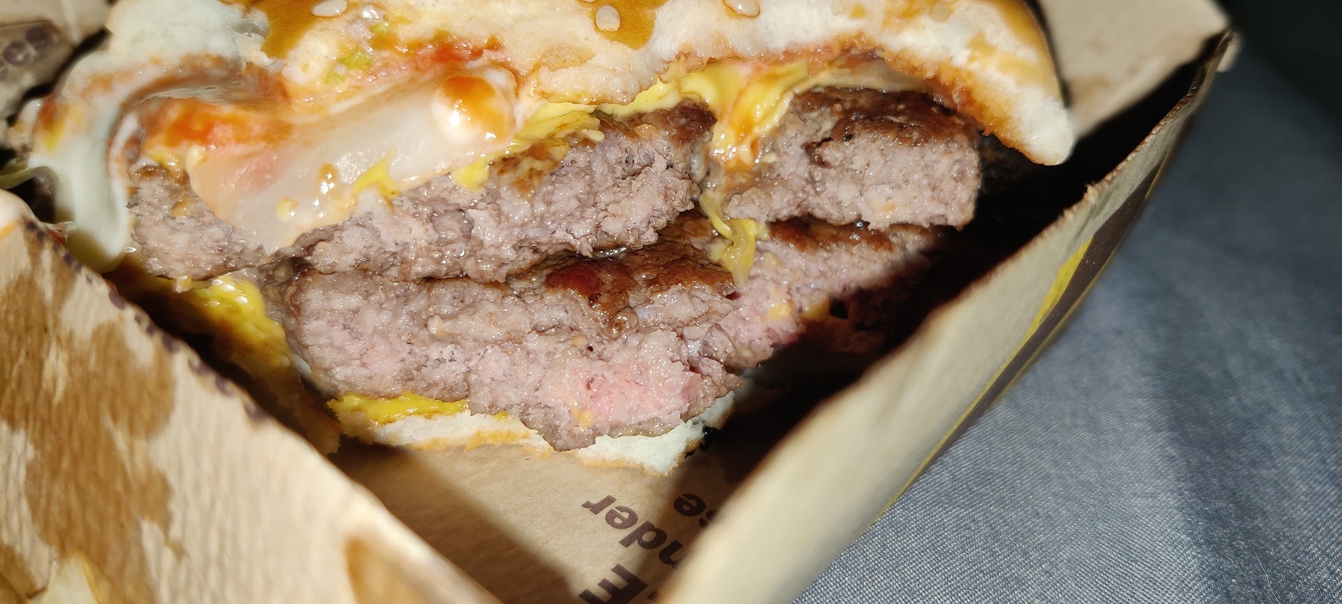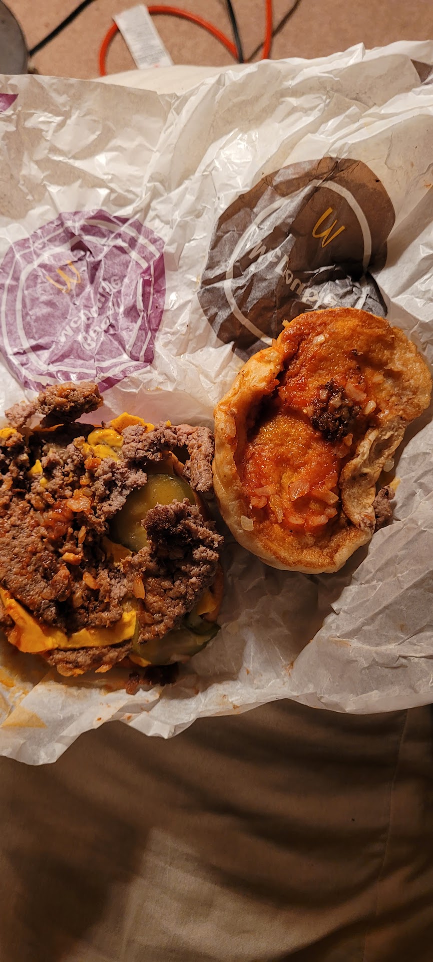 I take our food home and notice several issues with our food. While nothing was straight up missing, most aspects of the food had something off about them. First of all, both of our large fries were only half filled and were more equivalent to a medium or small. Some of the fries were also very cold. Not just room temperature cold, but like fresh from the freezer cold. Burger #1 (QPC deluxe) had undercooked patties. While not necessarily a problem for me who likes medium patties, I am aware this is definitely not standard for McDonald's. Burger #2 (QPC) requested extra onions and pickles, but the onions appeared to obviously be normal portioned and rather than extra or even regular pickles, there were zero instead???