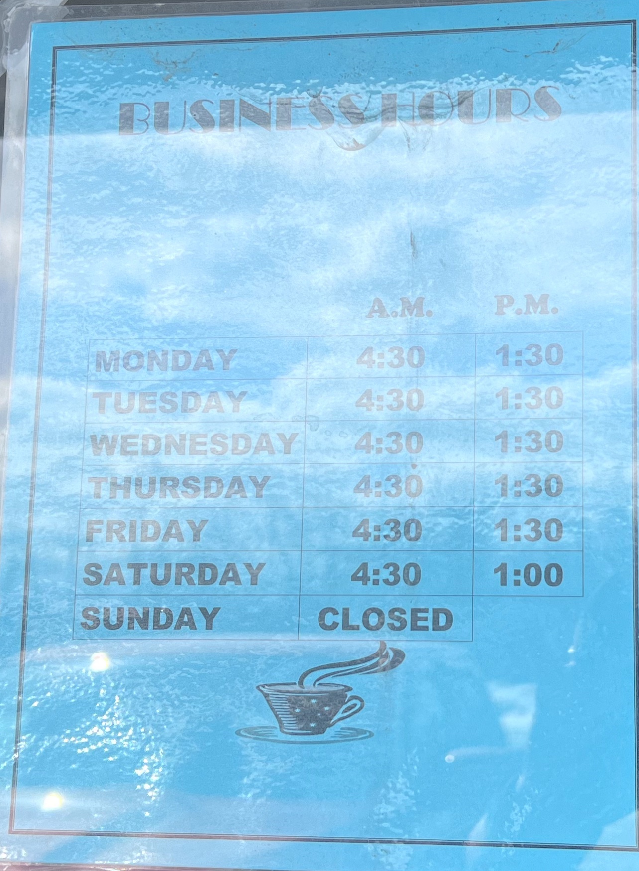 Nothing fancy here. Just good food cooked fresh. Only open for lunch and dinner. Frequented by locals and early risers (aka farm folk) that are up at 4am.