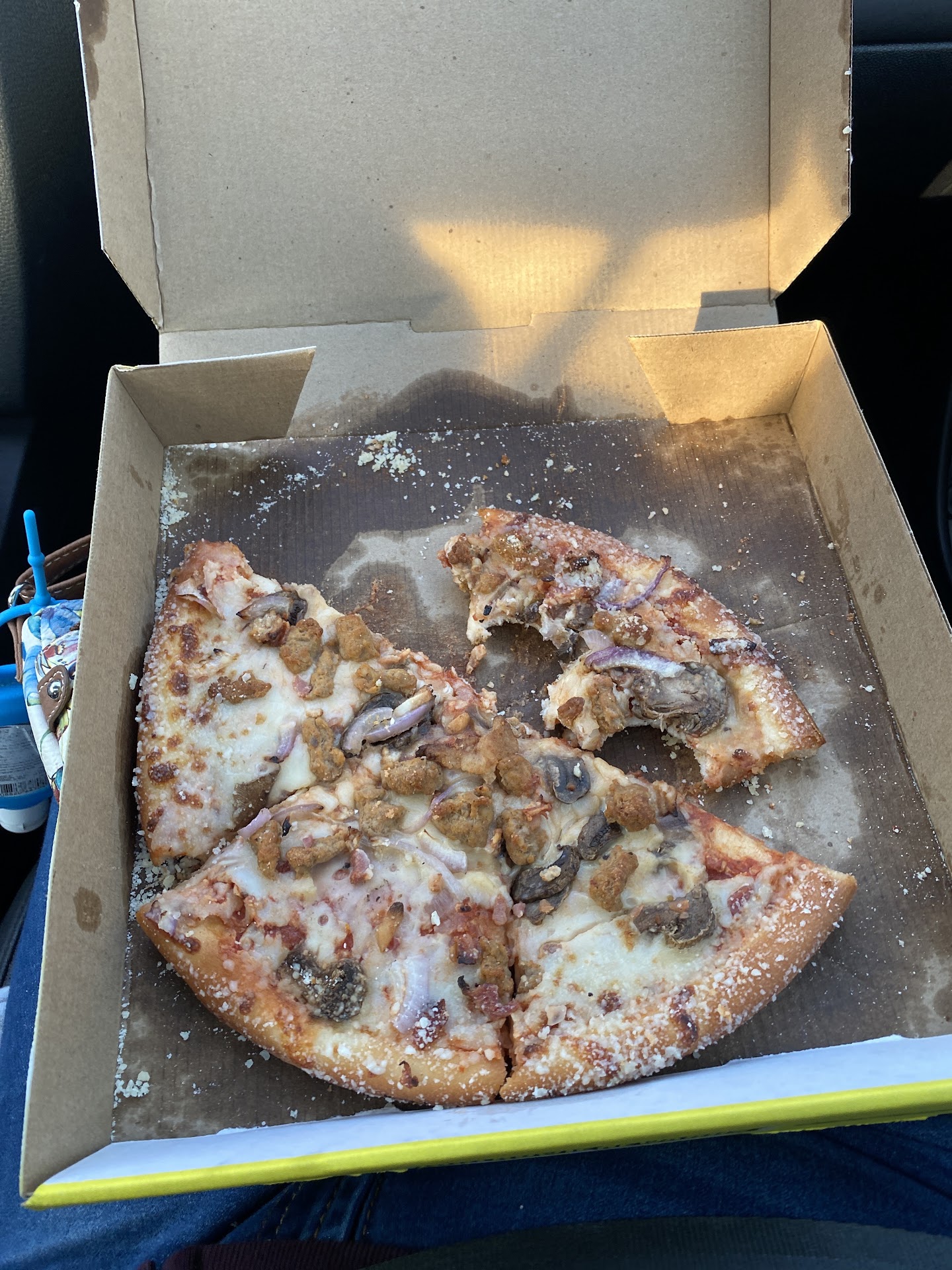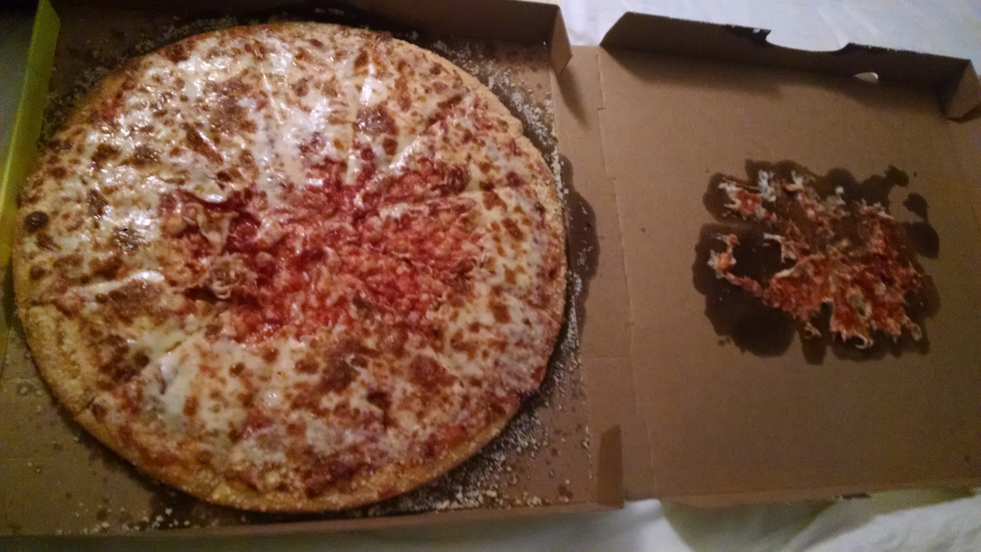 Read morePizza was cold when we had it delivered but the best part was when we opened the box the cheese was all stuck to the top and the pizza smashed. We also ordered a 2liter so by the look of the lid looks like they laid the 2 liter on top. The box for soft from the pizza getting cold and the box lid buckled in the center where the 2liter was. It was 1am we were hungry there were no other options near our hotel. We live 10hrs away so it seemed pointless to make a big fuss. We tried the pizza.... Gross! Maybe it was the coldness or the no cheese mushy dough.... It was gross. We ended up throwing it out. Complete...