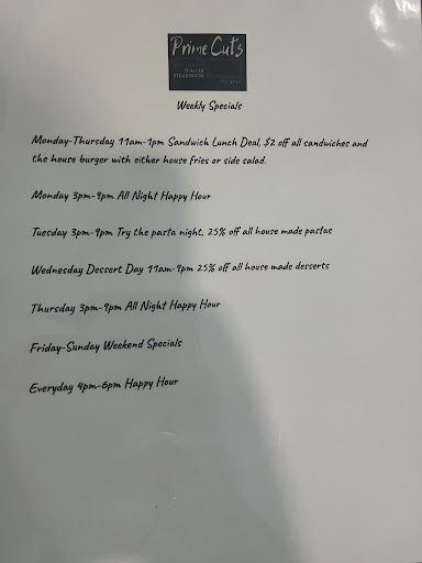 Read morePrime Cuts has a nice modern interior which allows it to stand out from other restaurants in our area which is a nice change of pace. My Fiance and I stopped there for dinner and we were quickly seated and the service was excellent. There are plenty of options on the menu and all of them are enticing, providing closer to home dishes such as Alfredo and spaghetti, but also providing a variety of other choices.