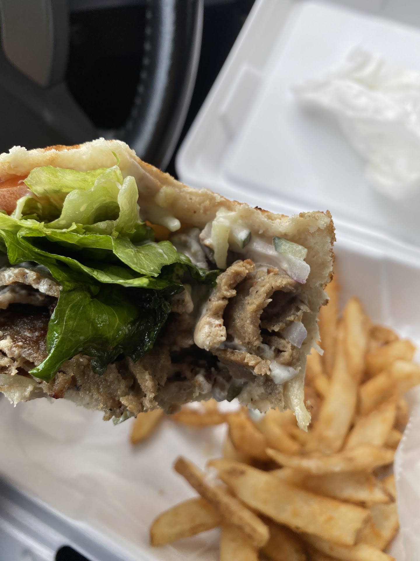 My husband got one of their bugers with fries, and I got the chicken souvlaki with a Greek salad.