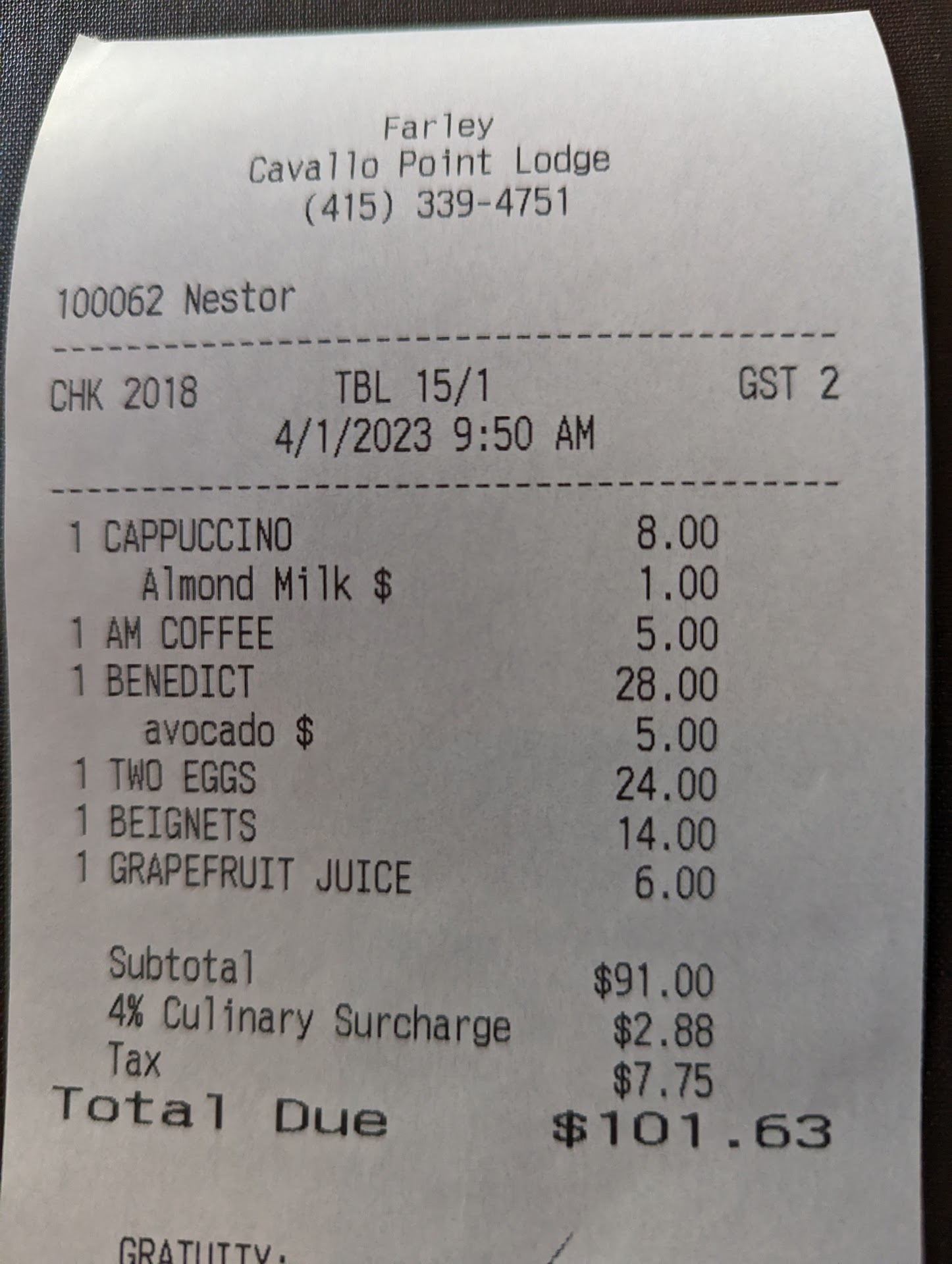 Read moreI am writing this to share the horrible experience we had today. We were staying at the lodge and dined at this place. We had dinner the previous night and it was mediocre food. We went back for breakfast and the light over the table had a heavy glass decorative covering, which all of a sudden just dropped and shattered on our breakfast plates and we were left with broken glass pieces on three of us sitting around the table. Luckily my 2 yr old was standing a little farther and nothing happened to her. The other people dining around us were also concerned and asked us if we were ok as the noise the glass caused when it crashed was loud as it was heavy. We got away from the table and the manager said âsorry, I am going to send breakfast to your room and it is on meâ. We ordered breakfast to our room and while checking out at noon, they gave us the bill for breakfast. We told the receptionist at the cavallo point lodge about what happened and called the manager who simply said that â I didnât tell them I would send breakfast to their room and cover it, the glass shattered on their plates and I apologized to themâ Firstly what happened to us was dangerous. And we didnât say a word after what happened as there were other people dining there and we didnât want to make it unpleasant for them. The manager tried to behave like she was trying to make it up to us for the bad experience but it just ended being false statements. This is far from hospitable and definitely the most unpleasant experience I had at any...