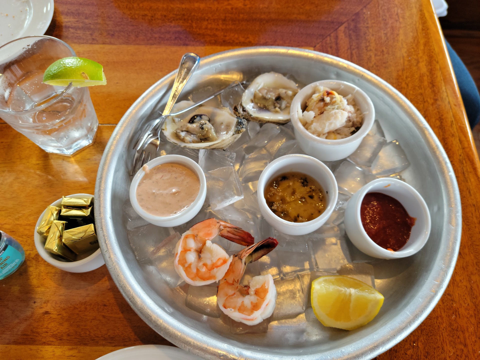 I mean that's five stars already just in that sense but now let me get to the food we had drinks he had a bloody mary which was my first time tasting it and it was delicious. I had a peach Bellini which left me feeling Giddy and it was mixed perfectly not too fizzy and not too sweet of peach puree. We ordered to start two appetizers which were the Dozen Blue Point oysters which we had baked half a dozen BBQ half a dozen lemon garlic parmesan. Oh may I say what a treat that was we also had lobster bisque with that and a delicious fresh sourdough and I want to say a softer type of bread or roll with cheese baked on it and I mean when you dip it into that lobster bisque it was to die for. Now on to our main course he ordered the cod fish and shrimp tacos I had the Captain Morgan salmon fillet with Yukon Gold potatoes and spinach. While I did not get to taste his fish tacos the salmon I had was excellent grilled to perfection and seasoned very well. We couldn't even have dessert last but not least let me say that our waitress and I usually get waiters and waitresses names and I'm so sad that I didn't get hers because she was very sweet very cool new the menu inside and out and if she ever reads this lady because of your energy we will be back okay.