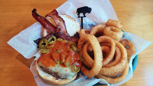 The Buffalo (Bison) El Diablo Burger (MR) with jalapeno bacon, pepperjack cheese, sliced jalapenos, BBQ sauce & their perfectly fried Onion Rings. This is my usual "Go To" Burger Basket - My Favorite! El Diablo w/ Kettle Chips: $11.59 sub Fries: $14.19 sub Rings: $14.59