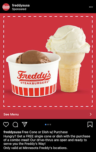 Read moreHorrible first time experience. The only reason I visited is because of a post by the franchise on IG captioned “get a FREE single cone or dish with the purchase of a combo meal! Only valid at Minnesota Freddy’s locations.”