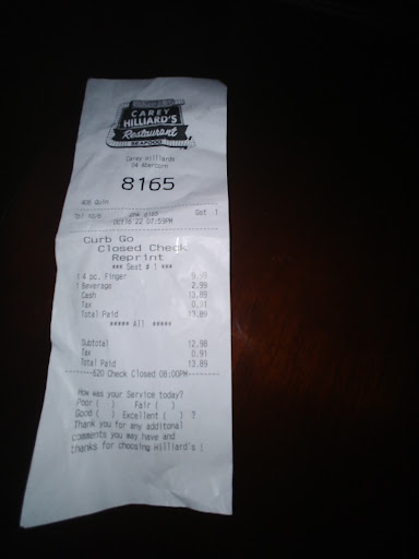 Read moreI wish our server from the Abercorn location on Friday 10/6/23 had been on a server cam. This service wasn't just bad. It was terrible , and the fact that we were served warm cole slaw that was spoiled made matters worse. This young lady literally dropped our plates on the table with enough of a thud that fries came off the plate. Dropped my 9 yr old grandson's 1st and then pushed it to slide it across the table to him. He even commented to his mother, "Mom, she must be mad." We were given plastic utensils to go packets, which was another first me. We had to asked for condiments as none were offered (we all 3 ordered seafood) we were never offered a refill on our drinks, again we had to ask as she was passing our table to go to another. When the young lady came with the check, we were just really starting to eat, so basically, she never came back to the table. My daughter went to the cashier counter and had to ask for to go boxes. We left feeling like we wished we had gone somewhere else. Things sure have changed since I worked at Carey Hilliards in this same location 30 years ago. I love Carey Hillards and will continue to go to the Pooler location where the food and SERVICE are always great, but never this one again. I know good help is hard to find, but this is just sad. Mr. Hilliard, this location needs some serious attention...