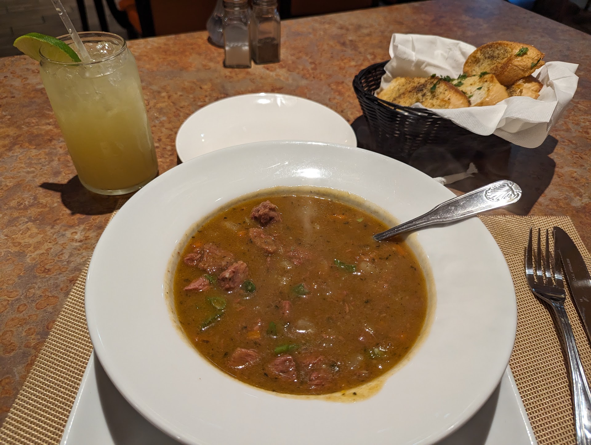 I had a bowl of the Haitian Beef and Butternut Squash soup and a green salad with shrimp along with a Haitian lemonade. Portion sizes are huge, and I was absolutely stuffed after just the soup, but I soldiered on and had some of the salad, and took the rest away (where it made an entire meal of its own).