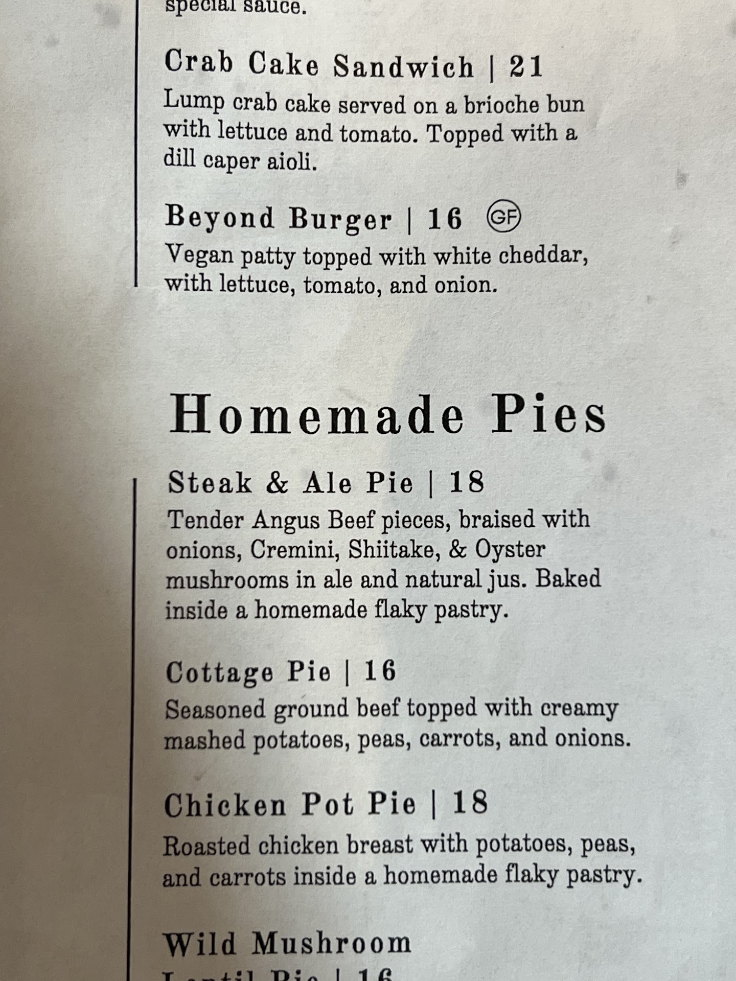 I ordered the Steak & Ale. It is not what you think. It is roast beef. Basic roast beef in a weird gravy with a sweet pastry slapped on top. There was no stuffed pastry as the description says. There was everyday roast beef which has a completely unique flavor in comparison to meat labeled steak. This dish is a fail to the description and the meat that was supposedly in the meal.
