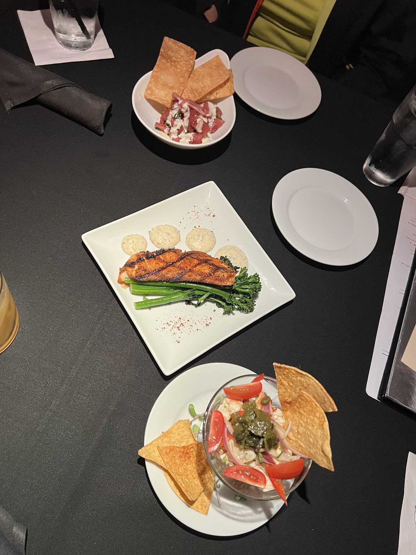 We ended up getting 4 tapas, all fish ones. The food came out really fast too. First we tried the grilled salmon, we split it among the 3 of us. It came with a Dijon dressing and broccolini. Salmon had AMAZING flavor and the sauce complimented it very nicely. Then we tried the flash fried calamari. I was a little skeptical about trying this, because I do not like heavily breaded, greasy calamari. But WOW, they cooked the squid perfectly, wasn’t too chewy at all. It was lightly fried and was flash fried in a white wine sauce, which gave it so much flavor. It also came with peppers and onions as well as banana peppers. Calamari was perfect, recommend trying that one, also a little bigger than the other tapas. Next we tried the tuna tartare with wonton chips. Never had tuna tartare, but after trying this…it is definitely something I want in the future. The wonton chips complimented the tuna perfectly. The tuna was amazing. Finally we got one of the specials, shrimp ceviche. Also never had this. They put poblano peppers and cilantro on theirs, and it worked so well! Super yummy, shrimp tasted great!